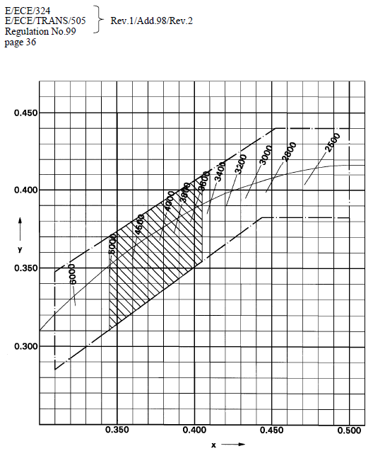 Цвет источника света измеряется в сферической поверхности с использованием системы измерения, которая показывает координаты цветности МЭК поступающего света с разрешающей способностью + 0,002. На нижеследующем рисунке показан диапазон цветности для белого цвета и ограниченный диапазон цветности для газоразрядных источников света D1R, D1S, D2R, D2S, D3R, D3S, D4R и D4S.