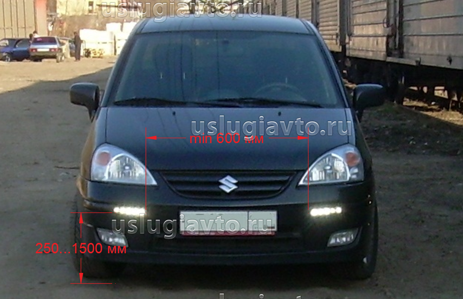 По длине: на передней части транспортного средства. Это требование считают выполненным, если излучаемый свет не мешает водителю ни непосредственно, ни косвенно за счет отражения устройствами непрямого обзора и/или другими отражающими поверхностями транспортного средства.