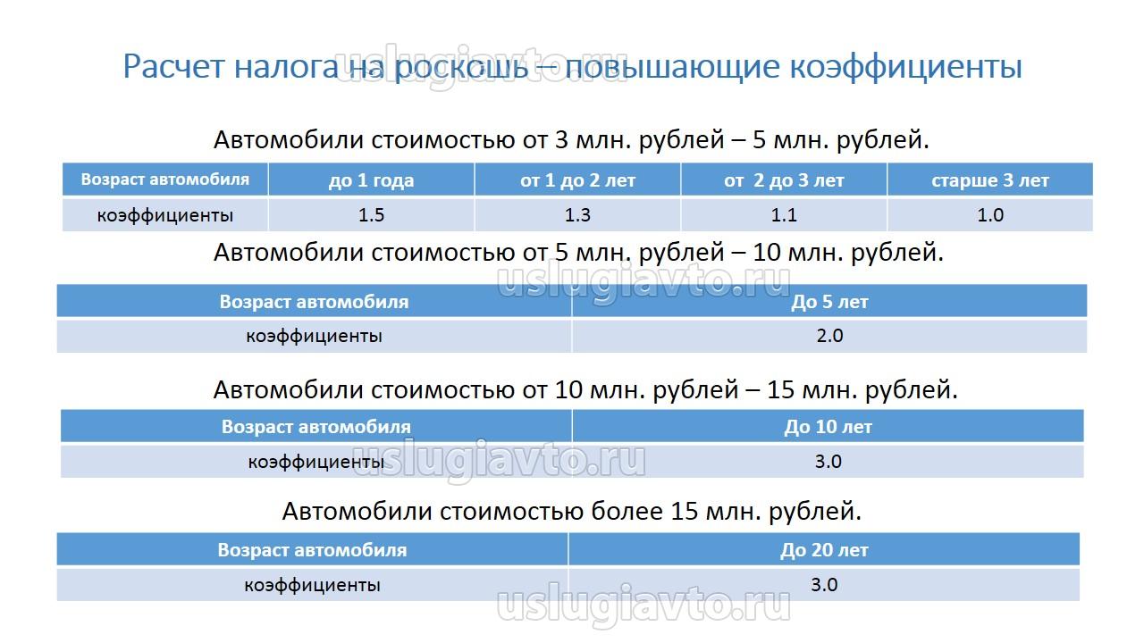 Принятый в 2013 году налог на роскошь, заработавший в 2014-м, предусматривает повышающий коэффициент к транспортному налогу для автомобилей стоимостью более трёх миллионов рублей. Налог подсчитывается с помощью специального коэффициента, размер которого зависит от стоимости транспортного средства и даты его выпуска.