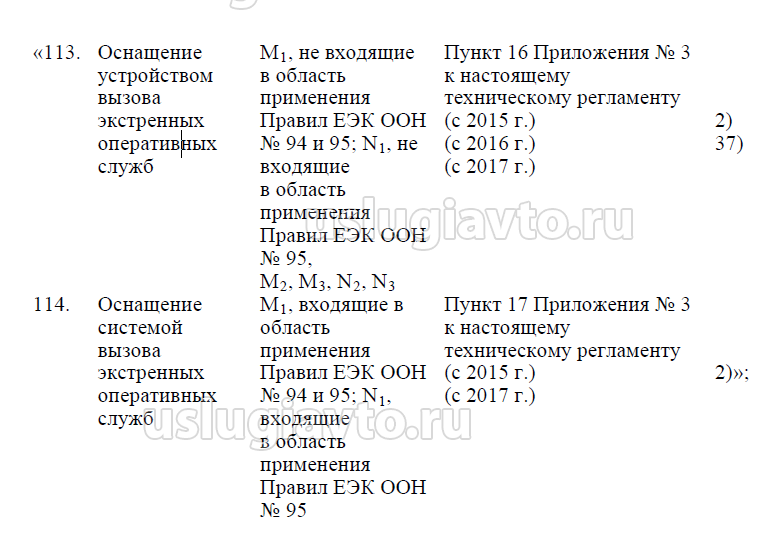 - устройствами вызова экстренных оперативных служб оснащаются транспортные средства категории М1, не входящие в область применения Правил ООН № 94 и 95; категории N1, не входящие в область применения Правил ООН № 95, а также категорий М2, М3, N2, N3.