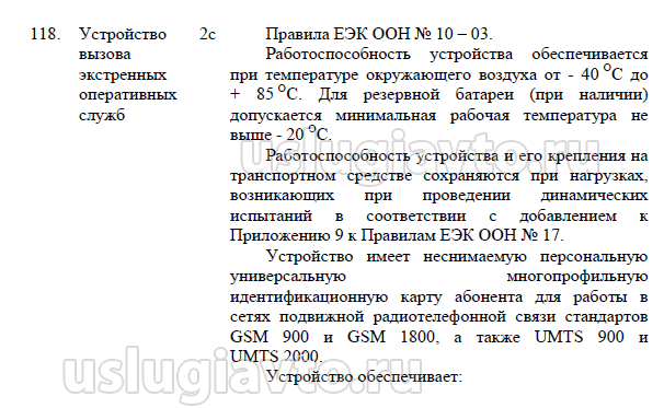 2, М3, N2 и N3 должны комплектоваться устройством вызова экстренных оперативных служб (далее –устройство), соответствующим требованиям пункта 118 приложения № 10 к настоящему техническому регламенту.