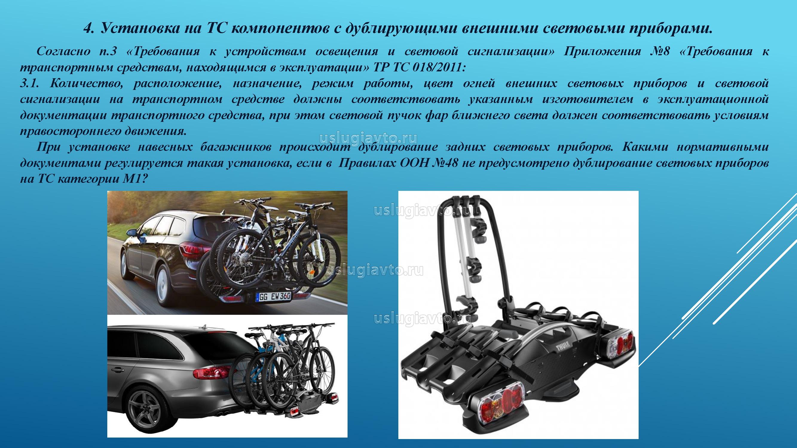 Так же происходит дублирование задних световых приборов, кроме того, с установкой багажника на задний свес, изменяются: габаритная длина ТС, распределение нагрузки на оси. Если эти данные еще можно подтвердить измерением и расчетом то, чем руководствоваться при дублировании световых приборов?