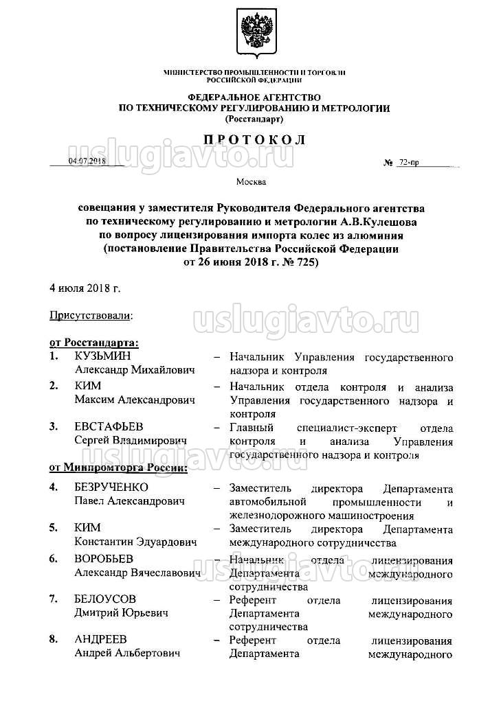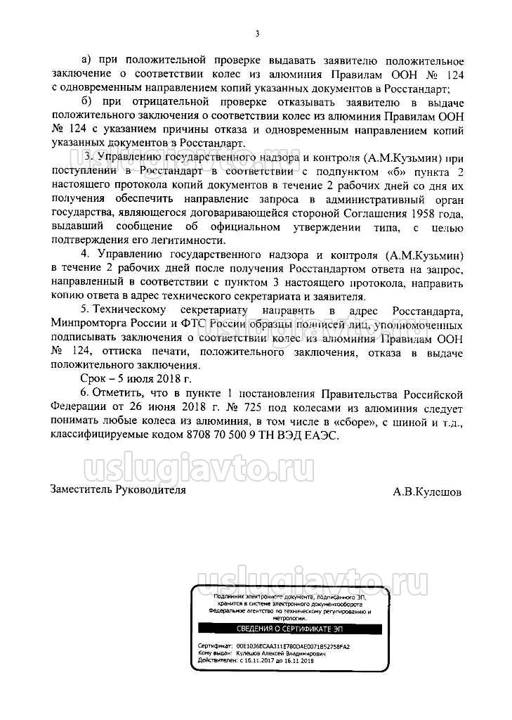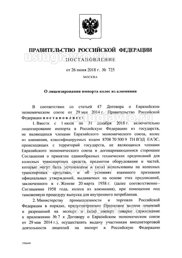 Минпромторга России и ФТС России образцы подписей лиц, уполномоченных подписывать заключения о соответствии колес из алюминия Правилам ООН № 124, оттиска печати, положительного заключения, отказа в выдаче положительного заключения. Срок - 5 июля 2018 г. 6. Отметить, что в пункте 1 постановления Правительства Российской Федерации от 26 июня 2018 г. № 725 под колесами из алюминия следует понимать любые колеса из алюминия, в том числе в «сборе», с шиной и т.д., классифицируемые кодом 8708 70 500 9 ТН ВЭД ЕАЭС.