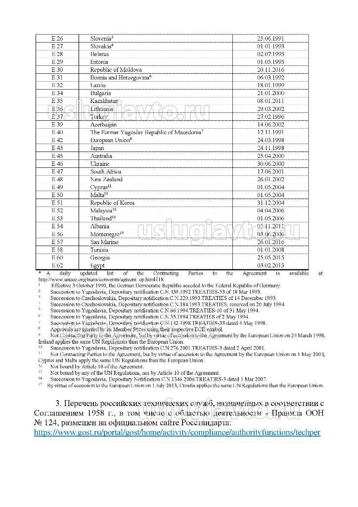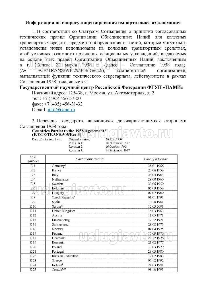 1. В соответствии со Статусом Соглашения о принятии согласованных технических правил Организации Объединенных Наций для колесных транспортных средств, предметов оборудования и частей, которые могут быть установлены и/или использованы на колесных транспортных средствах, и об условиях взаимного признания официальных утверждений, выдаваемых на основе этих правил Организации Объединенных Наций, заключенным в г. Женеве 20 марта 1958 г. (далее - Соглашение 1958 года) (№ ECE/TRANS/WP.29/343/Rev.26), компетентной организацией, выполняющей функции технического секретариата, действующего в рамках Соглашения 1958 года, является: Государственный научный центр Российской Федерации ФГУП «НАМИ» Почтовый адрес: 125438, г. Москва, ул. Автомоторная, д. 2 тел.: +7 (495) 456-57-00 факс: +7 (495) 456-31-32 E-mail: info@nami.ru. 2. Перечень государств, являющихся договаривающимися сторонами Соглашения 1958 года (см вложение) 3. Перечень российских технических служб, назначенных в соответствии с Соглашением 1958 г., в том числе с областью деятельности - Правила ООН № 124, размещен на официальном сайте Росстандарта: https://www.gost.ru/portal/gost/home/ac ... ns/techper