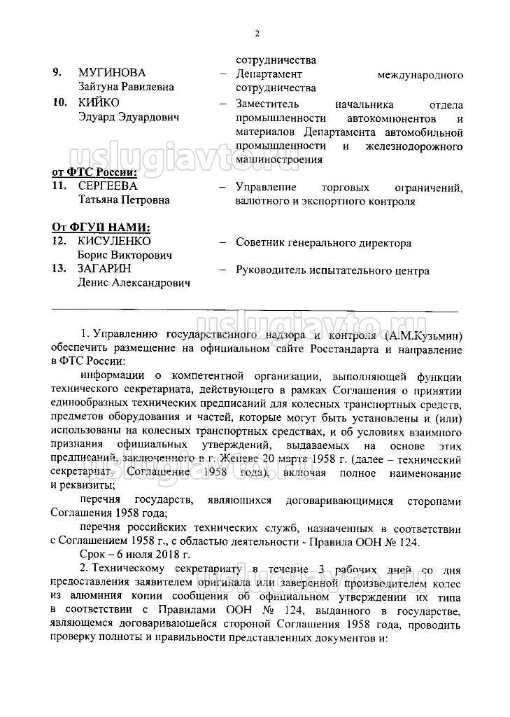 1. Управлению государственного надзора и контроля (А.М.Кузьмин) обеспечить размещение на официальном сайте Росстандарта и направление в ФТС России: информации о компетентной организации, выполняющей функции технического секретариата, действующего в рамках Соглашения о принятии единообразных технических предписаний для колесных транспортных средств, предметов оборудования и частей, которые могут быть установлены и (или) использованы на колесных транспортных средствах, и об условиях взаимного признания официальных утверждений, выдаваемых на основе этих предписаний, заключенного в г. Женеве 20 марта 1958 г. (далее - технический секретариат, Соглашение 1958 года), включая полное наименование и реквизиты;перечня государств, являющихся договаривающимися сторонами Соглашения 1958 года;перечня российских технических служб, назначенных в соответствии с Соглашением 1958 г., с областью деятельности - Правила ООН № 124.Срок - 6 июля 2018 г. 2. Техническому секретариату в течение 3 рабочих дней со дняпредоставления заявителем оригинала или заверенной производителем колес из алюминия копии сообщения об официальном утверждении их типа в соответствии с Правилами ООН № 124, выданного в государстве, являющемся договаривающейся стороной Соглашения 1958 года, проводить проверку полноты и правильности представленных документов и: а) при положительной проверке выдавать заявителю положительное заключение о соответствии колес из алюминия Правилам ООН № 124 с одновременным направлением копий указанных документов в Росстандарт; б) при отрицательной проверке отказывать заявителю в выдаче положительного заключения о соответствии колес из алюминия Правилам ООН № 124 с указанием причины отказа и одновременным направлением копий указанных документов в Росстандарт. 3. Управлению государственного надзора и контроля (А.М.Кузьмин) при поступлении в Росстандарт в соответствии с подпунктом «б» пункта 2 настоящего протокола копий документов в течение 2 рабочих дней со дня их получения обеспечить направление запроса в административный орган государства, являющегося договаривающейся стороной Соглашения 1958 года, выдавший сообщение об официальном утверждении типа, с целью подтверждения его легитимности.4. Управлению государственного надзора и контроля (А.М.Кузьмин) в течение 2 рабочих дней после получения Росстандартом ответа на запрос, направленный в соответствии с пунктом 3 настоящего протокола, направить копию ответа в адрес технического секретариата и заявителя. 5. Техническому секретариату направить в адрес Росстандарта,