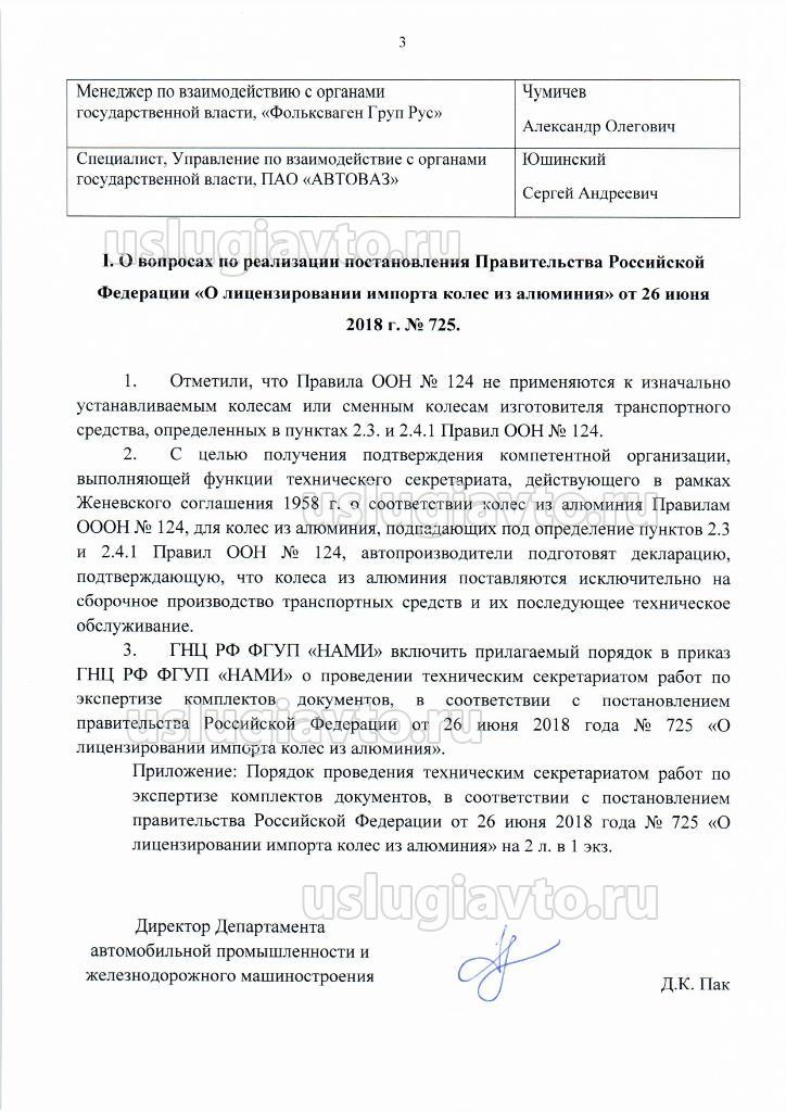 3. ГНЦ РФ ФГУП «НАМИ» включить прилагаемый порядок в приказ ГНЦ РФ ФГУП «НАМИ» о проведении техническим секретариатом работ по экспертизе комплектов документов, в соответствии с постановлением правительства Российской Федерации от 26 июня 2018 года № 725 «О лицензировании импорта колес из алюминия». Приложение: Порядок проведения техническим секретариатом работ по экспертизе комплектов документов, в соответствии с постановлением правительства Российской Федерации от 26 июня 2018 года № 725 «О лицензировании импорта колес из алюминия» на 2 л. в 1 экз.