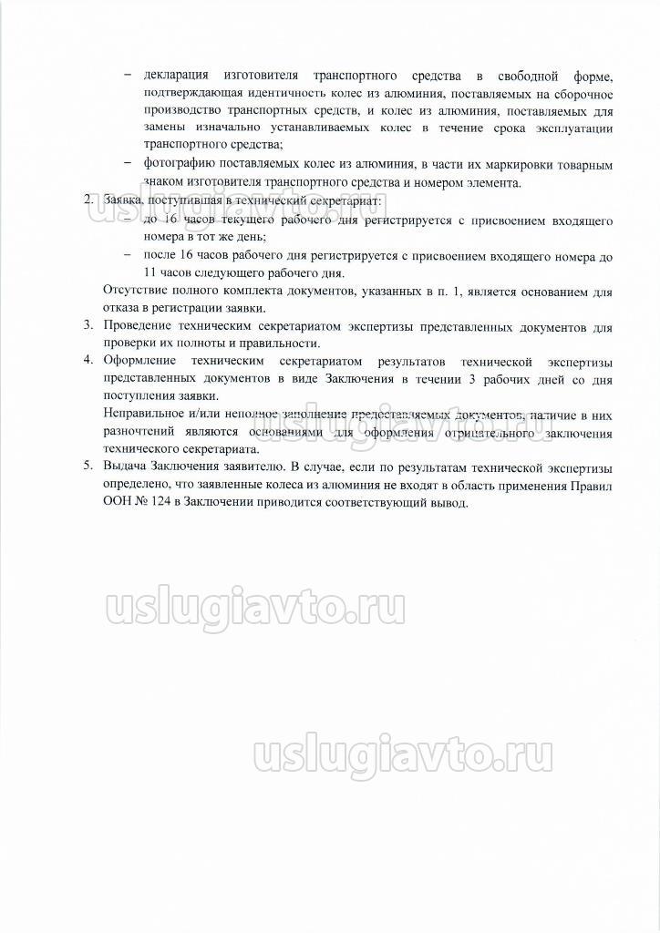проведения техническим секретариатом работ по экспертизе комплектов документов, в соответствии с постановлением правительства Российской Федерации от 26 июня 2018 года № 725 «О лицензировании импорта колес из алюминия».1. Для получения заключения компетентной организации, выполняющей функции технического секретариата (далее - технический секретариат), о соответствии колес из алюминия Правилам ООН № 124 (далее - заключение) заявитель представляет в технический секретариат заявку по утвержденной форме. К заявке в обязательном порядке прилагаются:- оригинал сообщения об официальном утверждении типа колес из алюминия в соответствии с Правилами ООН № 124 или его заверенная производителем колес из алюминия копия, а также заверенный в установленном порядке его перевод на русский язык;- копии документов, составляющих досье официального утверждения, которые были переданы компетентному органу, предоставившему официальное утверждение. В случае изначально устанавливаемых колес, подпадающих под определение п. 2.3. Правил ООН № 124, к заявке в обязательном порядке прилагаются:- копия документа, подтверждающая, что заявитель является изготовителем транспортных средств (свидетельство о присвоении международного идентификационного кода изготовителя WMI); - заверенная копия одобрения типа транспортного средства, выданного на транспортные средства, для производства которых поставляются колеса из алюминия;- декларация изготовителя транспортного средства в свободной форме, подтверждающая что колеса из алюминия, поставляются исключительно на сборочное производство транспортных средств и их последующее техническое обслуживание;- фотографию поставляемых колес из алюминия, в части их маркировки товарным знаком изготовителя транспортного средства и номером элемента. В случае сменных колес изготовителя транспортного средства, подпадающих под определение п. 2.4.1. Правил ООН № 124, к заявке в обязательном порядке прилагаются:- заверенная копия контракта на поставку колес из алюминия между изготовителем транспортного средства и официальным представителем изготовителя, указанным в одобрении типа транспортного средства, выданным на транспортные средства, для которого колеса поставляются;- заверенные копии одобрения типа транспортного средства и оформленного на основании указанного одобрения типа транспортного средства сертификата соответствия на компоненты транспортного средства, для которого предназначены ввозимые колеса из алюминия;- декларация изготовителя транспортного средства в свободной форме, подтверждающая идентичность колес из алюминия, поставляемых на сборочное производство транспортных средств, и колес из алюминия, поставляемых для замены изначально устанавливаемых колес в течение срока эксплуатации транспортного средства;- фотографию поставляемых колес из алюминия, в части их маркировки товарным знаком изготовителя транспортного средства и номером элемента. 2. Заявка, поступившая в технический секретариат:- до 16 часов текущего рабочего дня регистрируется с присвоением входящего номера в тот же день;- после 16 часов рабочего дня регистрируется с присвоением входящего номера до 11 часов следующего рабочего дня. Отсутствие полного комплекта документов, указанных в п. 1, является основанием для отказа в регистраци