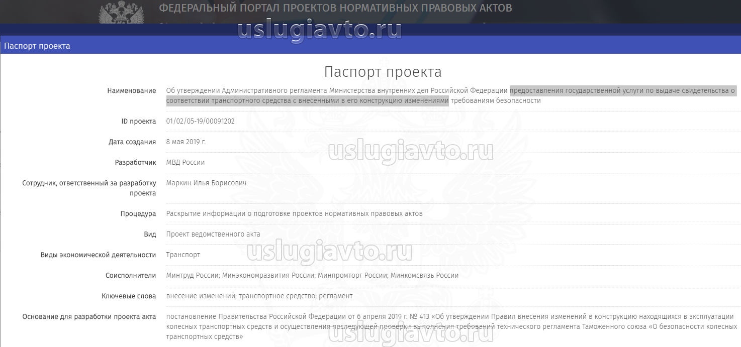 На портале нормативно правовых актов опубликован проект Административного регламента МВД РФ предоставления государственной услуги по выдаче свидетельства о соответствии транспортного средства с внесенными в его конструкцию изменениями требованиям безопасности (2 этап)