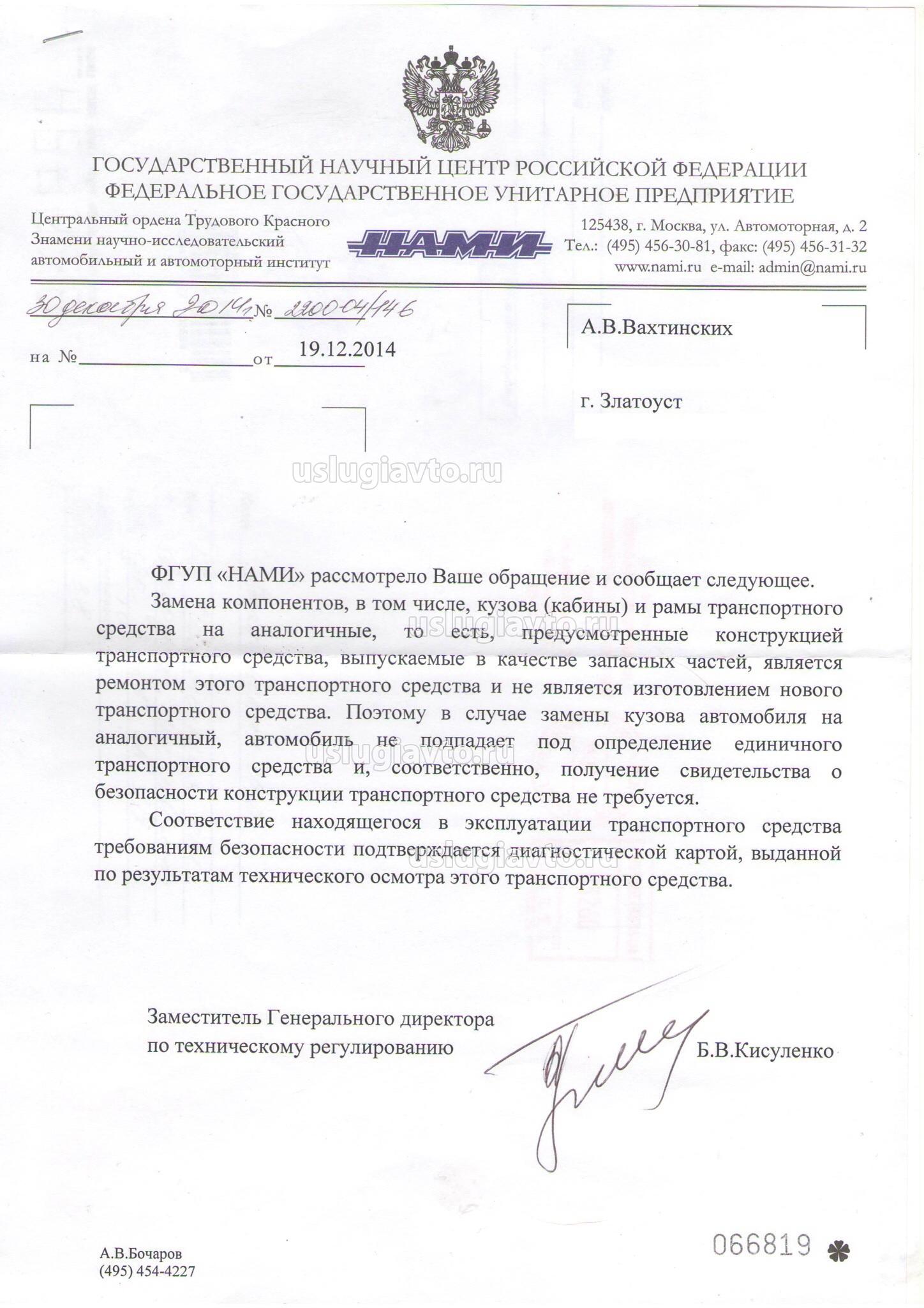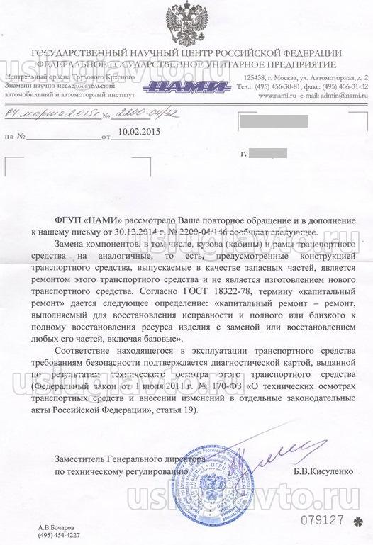 Разъяснение ФГУП "НАМИ" о том что замена кузова или рамы на аналогичные, той же модели марки и производителя, не является внесением изменений в конструкцию транспортного средства, а является РЕМОНТОМ. И что после замены кузова или рамы на аналогичные, транспортное средство не под подает под понятие ЕДИНИЧНОЕ ТРАНСПОРТНОЕ СРЕДСТВО, на которое необходимо получать СБКТС.