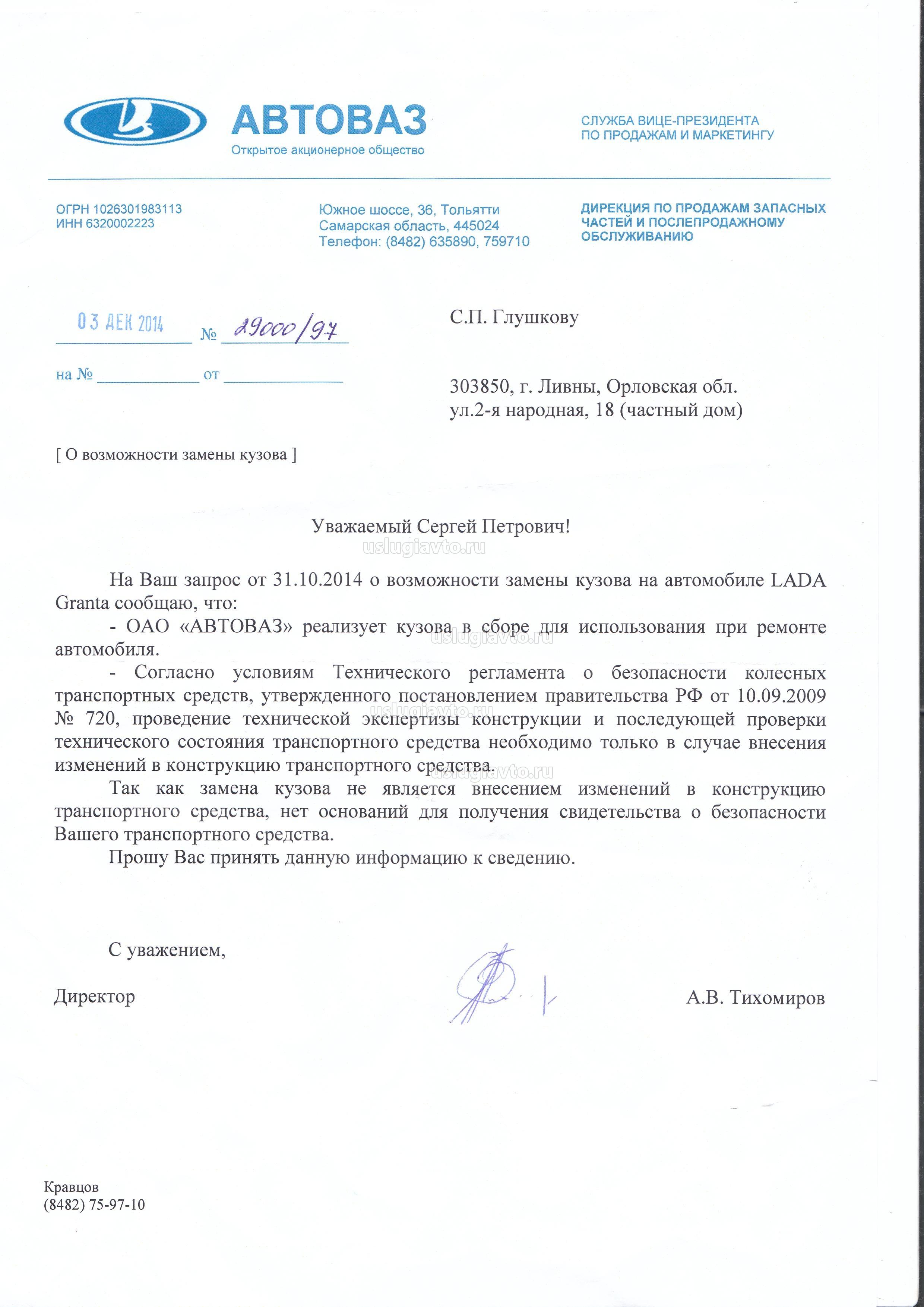 Официальный ответ АвтоВАЗа, по вопросу замены кузова один в один.