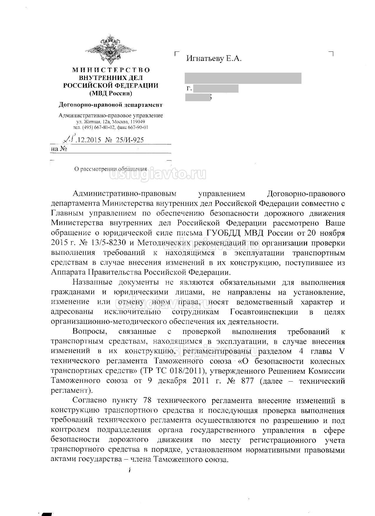 Дополнительно сообщаем, что контрольные (надзорные) функции за соблюдением обязательных для применения и исполнения требований безопасности, установленных техническим регламентом, осуществляет Министерство внутренних дел Российской Федерации, являющееся в соответствии с постановлением Правительства Российской Федерации от 16 октября 2015 г. № 1108, уполномоченным органом Российской Федерации по обеспечению государственного контроля (надзора) в отношении колесных транспортных средств, находящихся в эксплуатации на территории Российской Федерации.