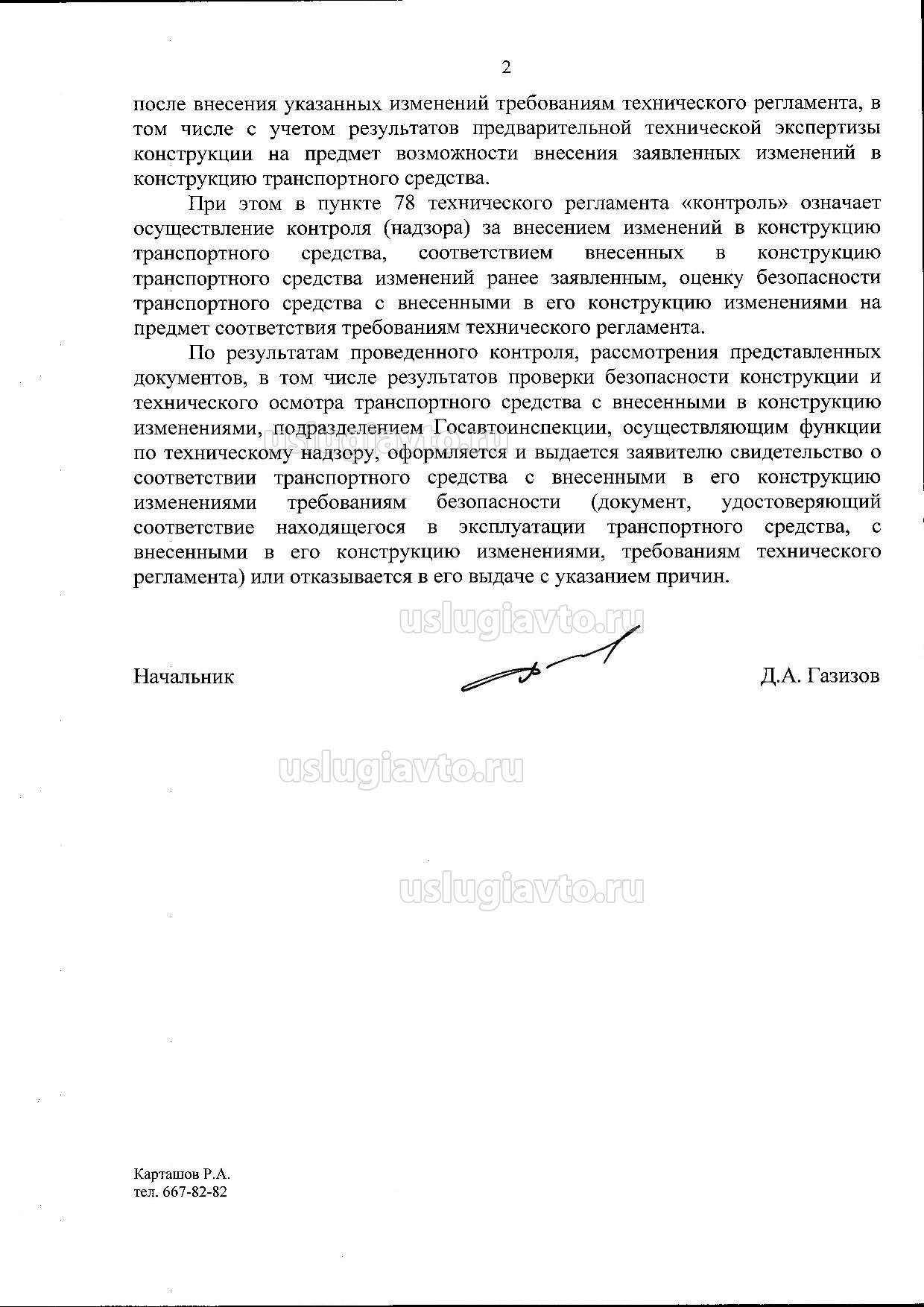 Пунктами 78-79 технического регламента определено, что внесение изменений в конструкцию транспортного средства и последующая проверка выполнения требований технического регламента осуществляются по разрешению и под контролем подразделения органа государственного управления в сфере безопасности дорожного движения по месту регистрационного учета транспортного средства с выдачей территориальным подразделением органа государственного управления в сфере безопасности дорожного движения заявителю свидетельства о соответствии транспортного средства с внесенными в его конструкцию изменениями требованиям безопасности по форме, предусмотренной приложением № 18 к техническому регламенту, или отказом в его выдаче с указанием причин.