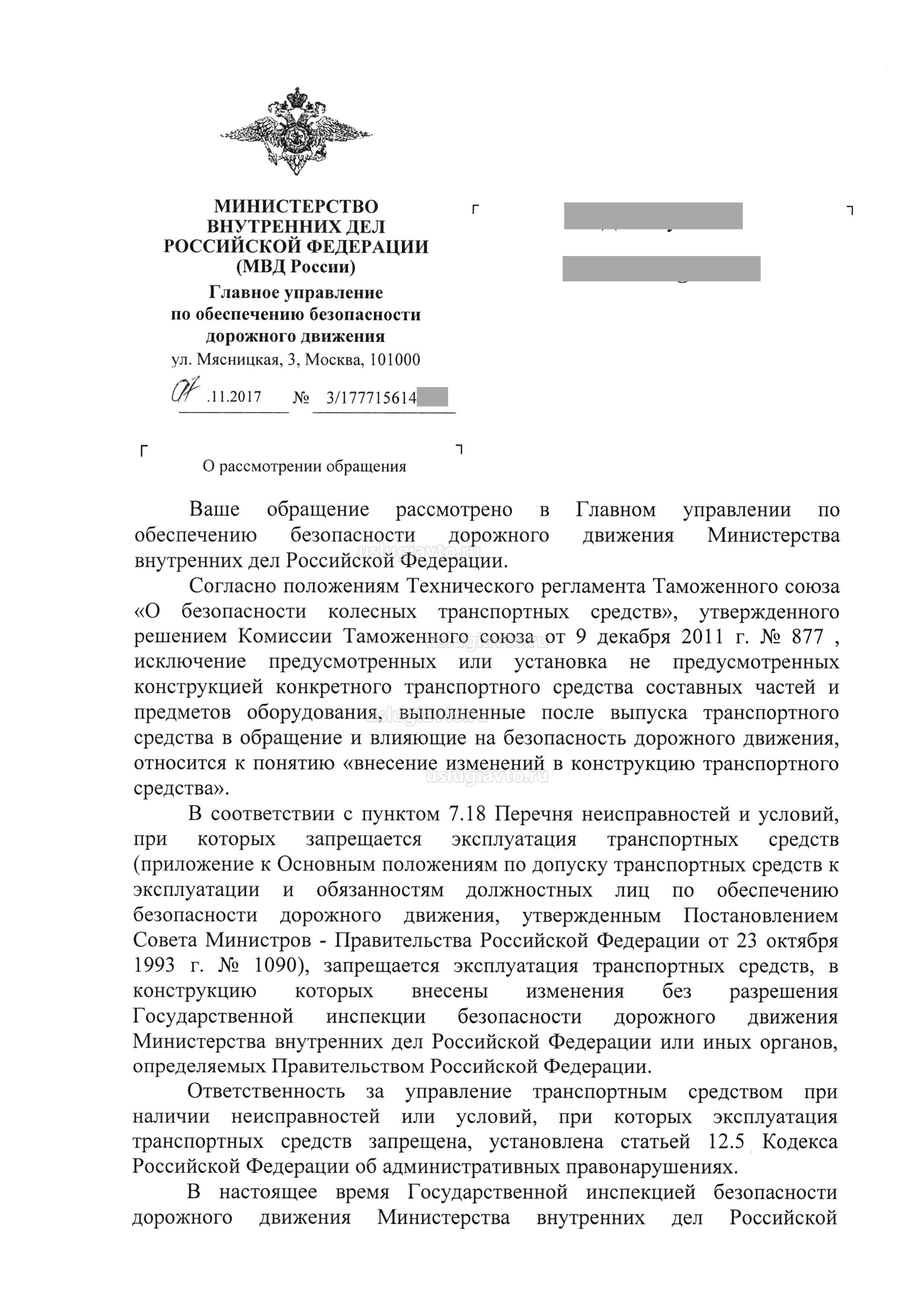 Ваше обращение рассмотрено в Главном управлении по обеспечению безопасности дорожного движения Министерства внутренних дел Российской Федерации. Согласно положениям Технического регламента Таможенного союза «О безопасности колесных транспортных средств», утвержденного решением Комиссии Таможенного союза от 9 декабря 2011 г. № 877 , исключение предусмотренных или установка не предусмотренных конструкцией конкретного транспортного средства составных частей и предметов оборудования, выполненные после выпуска транспортного средства в обращение и влияющие на безопасность дорожного движения, относится к понятию «внесение изменений в конструкцию транспортного средства». В соответствии с пунктом 7.18 Перечня неисправностей и условий, при которых запрещается эксплуатация транспортных средств (приложение к Основным положениям по допуску транспортных средств к эксплуатации и обязанностям должностных лиц по обеспечению безопасности дорожного движения, утвержденным Постановлением Совета Министров - Правительства Российской Федерации от 23 октября 1993 г. № 1090), запрещается эксплуатация транспортных средств, в конструкцию которых внесены изменения без разрешения Государственной инспекции безопасности дорожного движения Министерства внутренних дел Российской Федерации или иных органов, определяемых Правительством Российской Федерации. Ответственность за управление транспортным средством при наличии неисправностей или условий, при которых эксплуатация транспортных средств запрещена, установлена статьей 12.5 Кодекса Российской Федерации об административных правонарушениях. В настоящее время Государственной инспекцией безопасности дорожного движения Министерства внутренних дел Российской Федерации организован контроль за внесением изменений в конструкцию зарегистрированных в Госавтоинспекции транспортных средств в соответствии с требованиями раздела 4 главы V Технического регламента (Проверка выполнения требований к транспортным средствам, находящимся в эксплуатации, в случае внесения изменений в их конструкцию). Проверка, предусмотренная указанным разделом Технического регламента, проводится независимо от места учета транспортных средств подразделениями Госавтоинспекции, осуществляющими функции по техническому надзору, а в случае их отсутствия - подразделениями, определяемыми главным государственным инспектором безопасности дорожного движения по субъекту Российской Федерации. Оформление результатов предусмотренных требованиями Технического регламента предварительных технических экспертиз и проверок безопасности конструкции транспортного средства с внесенными в конструкцию изменениями целесообразно осуществлять аккредитованными на технический регламент испытательными лабораториями (центрами), включенными в Единый реестр органов по сертификации и испытательных лабораторий (центров) Таможенного союза. Указанный реестр размещен на странице Департамента технического регулирования официального сайта Евразийской экономической комиссии: http://www.eurasiancommission.org/ru. Вопрос о возможности внесения изменений в конструкцию транспортного средства рассматривается при наличии соответствующего заявления, положительных результатов предварительной технической экспертизы, оформленных организ