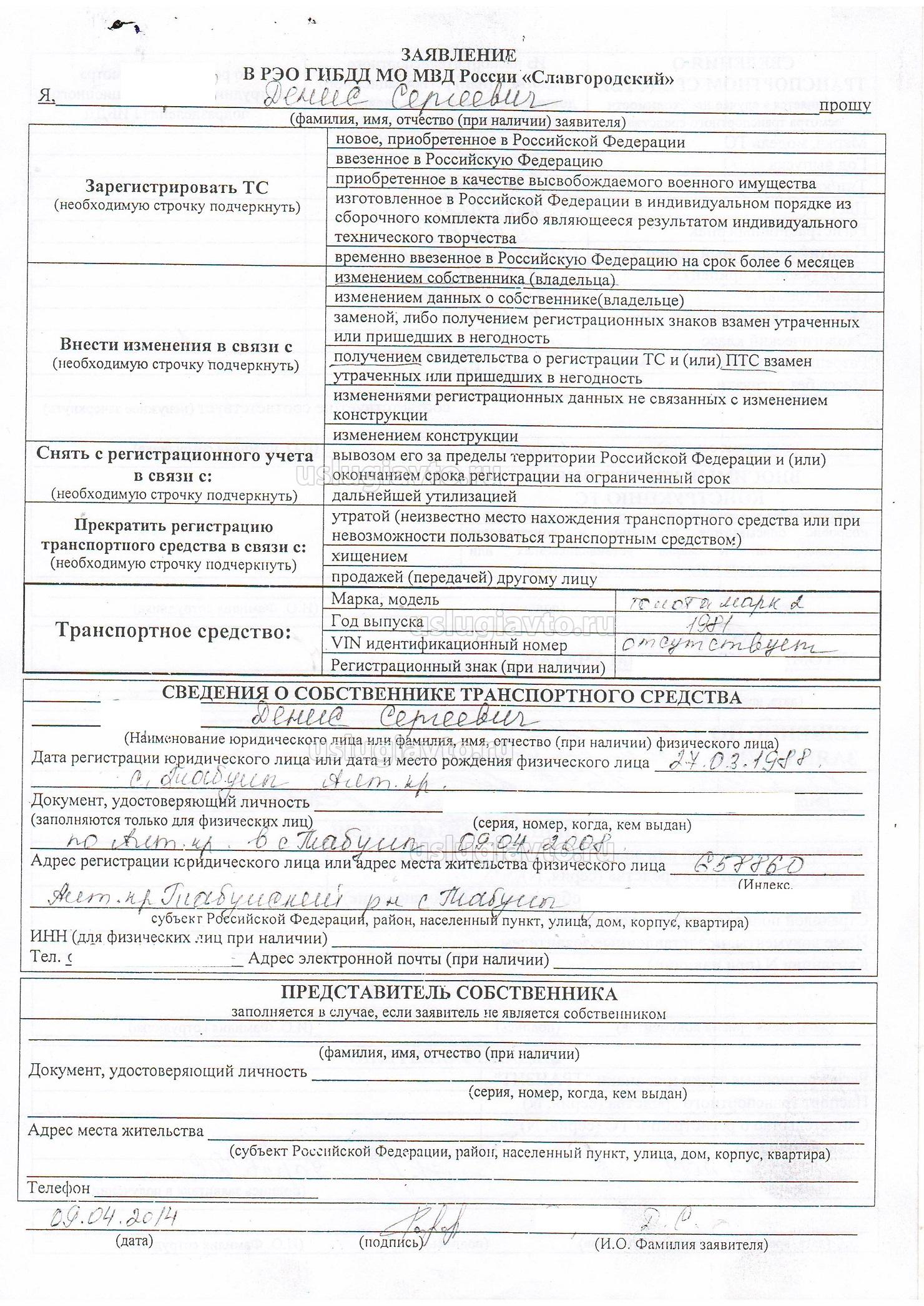 Результатом административной процедуры по осмотру транспортного средства является отметка в заявлении, заверенная подписью с указанием фамилии сотрудника, проводившего осмотр, даты и времени проведения осмотра. При расхождении сведений о транспортном средстве с данными, указанным в заявлении, а также при установлении несоответствий и (или) признаков изменения маркировочных обозначений и (или) конструкции транспортного средства, указанные сведения описываются в заявлении.