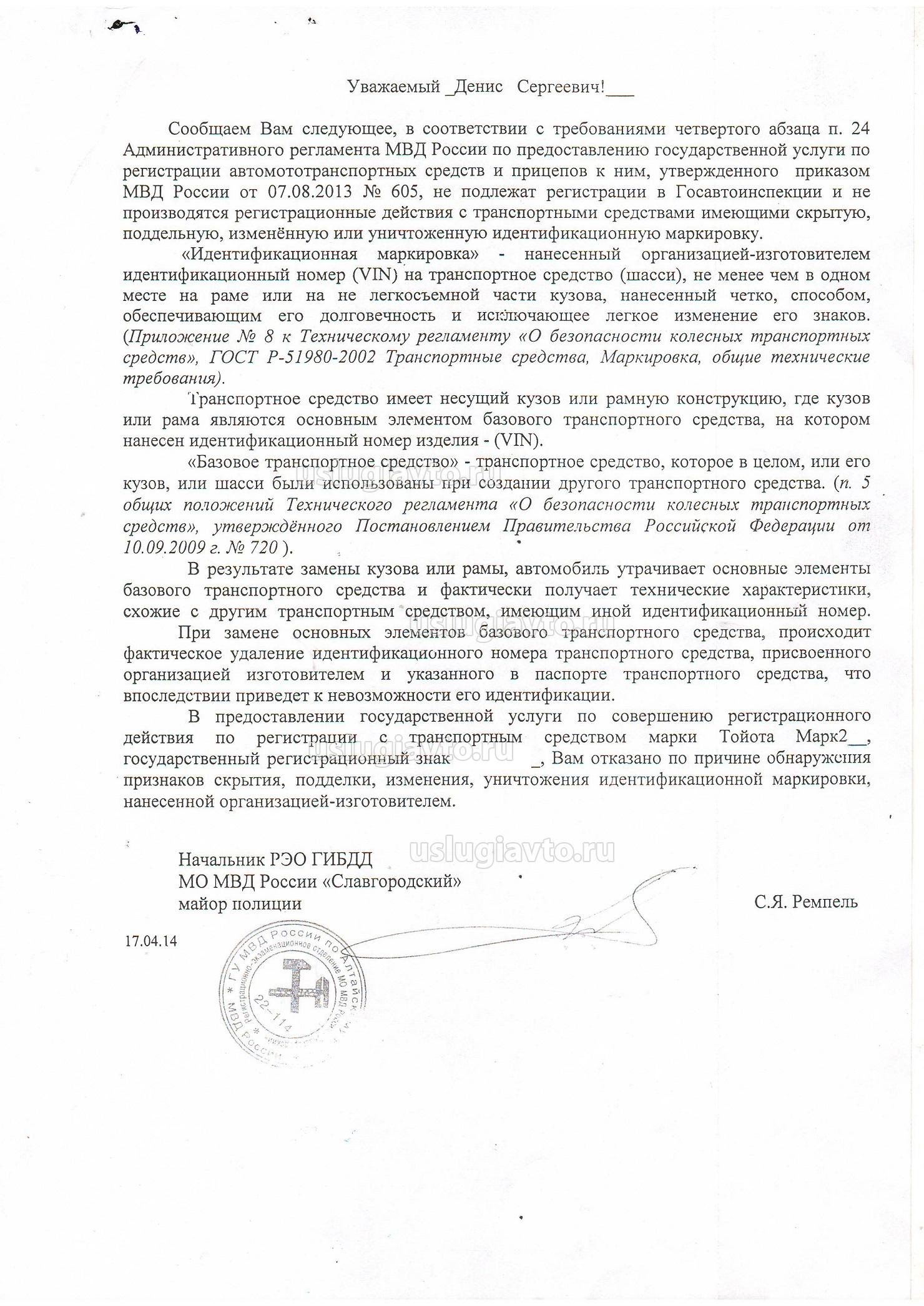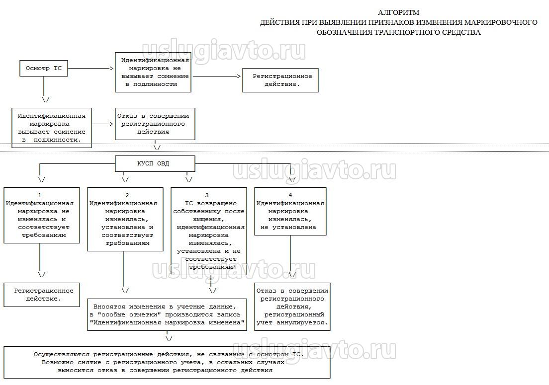 При представлении на осмотр транспортного средства с признаками изменения, уничтожения маркировки регистрационное действие не осуществляется, выносится мотивированный отказ (Приложение N 2).