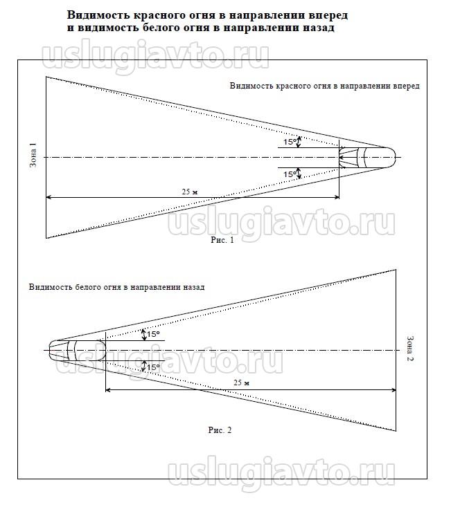 - в отношении видимости белого света в направлении назад, за исключением задних фар и нанесенной на транспортное средство по бокам белой маркировки с улучшенными светоотражающими характеристиками, нужно, чтобы видимая поверхность белого огня не была непосредственно видима для наблюдателя, перемещающегося в зоне 2 поперечной плоскости на расстоянии 25 м сзади от транспортного средства (см. рис.2).
