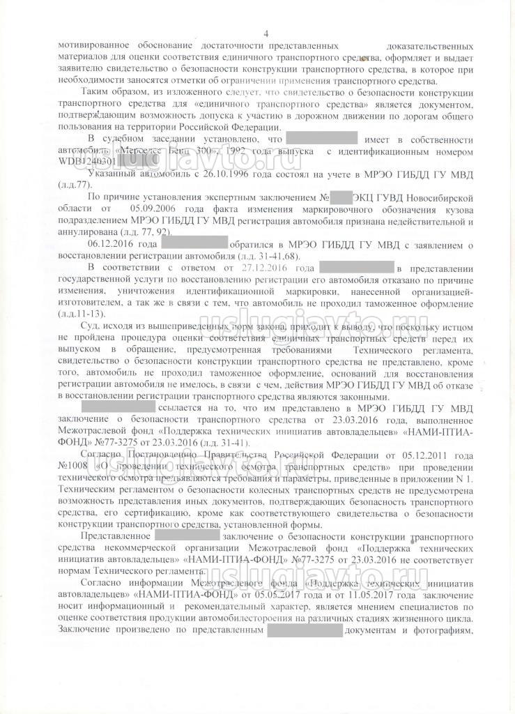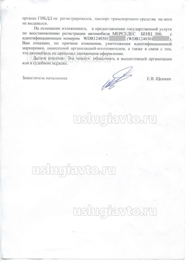 приказом Министерства внутренних дел Российской Федерации № 605 от 07.08.2013 (далее-Административный регламент). В соответствии с требованиями пункта 3 Правил, а также пункта 24 Административного регламента, не подлежат регистрации в Госавтоинспекции и не проводятся регистрационные действия с транспортными средствами, а также государственная услуга не предоставляется в отношении транспортных средств, ввезенных на территорию Российской Федерации сроком более чем на шесть месяцев, без предоставления документов, подтверждающих проведение их сертификации в соответствии с законодательством Российской Федерации, либо подтверждающих их выпуск на территории Таможенного союза без ограничений по их пользованию и распоряжению или с таможенными ограничениями, установленными таможенными органами, а также при обнаружении признаков скрытия, подделки, изменения, уничтожения идентификационной маркировки, нанесенной на транспортные средства организациями-изготовителями, либо подделки представленных документов, несоответствия транспортных средств и номерных агрегатов сведениям, указанным в предоставленных документах... «Идентификационная маркировка» - нанесенный организацией-изготовителем идентификационный номер (VIN) на транспортное средство (шасси), не менее чем в одном месте на раме или на не легкосъемной части кузова, нанесенный четко, способом, обеспечивающим его долговечность и исключающее легкое изменение его знаков. (Приложение № 7 к Техническому регламенту таможенного союза ТР ТС 018/2011 «О безопасности колесных транспортных средств», Утвержденного Решением Комиссии Таможенного союза от 9.12.2011 года №877) Пунктом 12 пп. «3» «Положения о Государственной инспекции безопасности дорожного движения Министерства внутренних дел Российской Федерации», утвержденного Указом Президента Российской Федерации от 15 июня 1998г. №711 «О дополнительных мерах по обеспечению безопасности дорожного движения» определено, что транспортные средства имеющие скрытые, поддельные, измененные номера узлов и агрегатов не допускаются к участию в дорожном движении путем отказа в регистрации и выдаче соответствующих документов. Установлено, что принадлежащий Вам автомобиль МЕРСЕДЕС БЕНЦ 300, имеет измененный идентификационный номер кузова, и наличие факта установления на данном автомобиле панели с «первоначальным идентификационным номером», не является устранением причины, явившейся основанием для аннулирования регистрации. ЗАО «СТС- Автомобили» не может и не имеет возможности установить панель в соответствии и по стандартам завода- изготовителя, так как является официальным дилером, а не заводом-изготовителем автомобилей марки «МЕРСЕДЕС БЕНЦ». Кроме этого, автомобиль МЕРСЕДЕС БЕНЦ 300, с идентификационным номером WDB1240301ХХХ, таможенного оформления не проходил, в органах ГИБДД не регистрировался, паспорт транспортного средства на него не выдавался. На основании изложенного, в предоставлении государственной услуги по восстановлению регистрации автомобиля МЕРСЕДЕС БЕНЦ 300, с идентификационным номером WDB1240301ХХХХ (WDB1240301ХХХХХ), Вам отказано, по причине изменения, уничтожения идентификационной маркировки, нанесенной организацией-изготовителем, а также в связи с тем, что автомобиль не проходил таможенное оформление. Данное решение Вы можете обжа