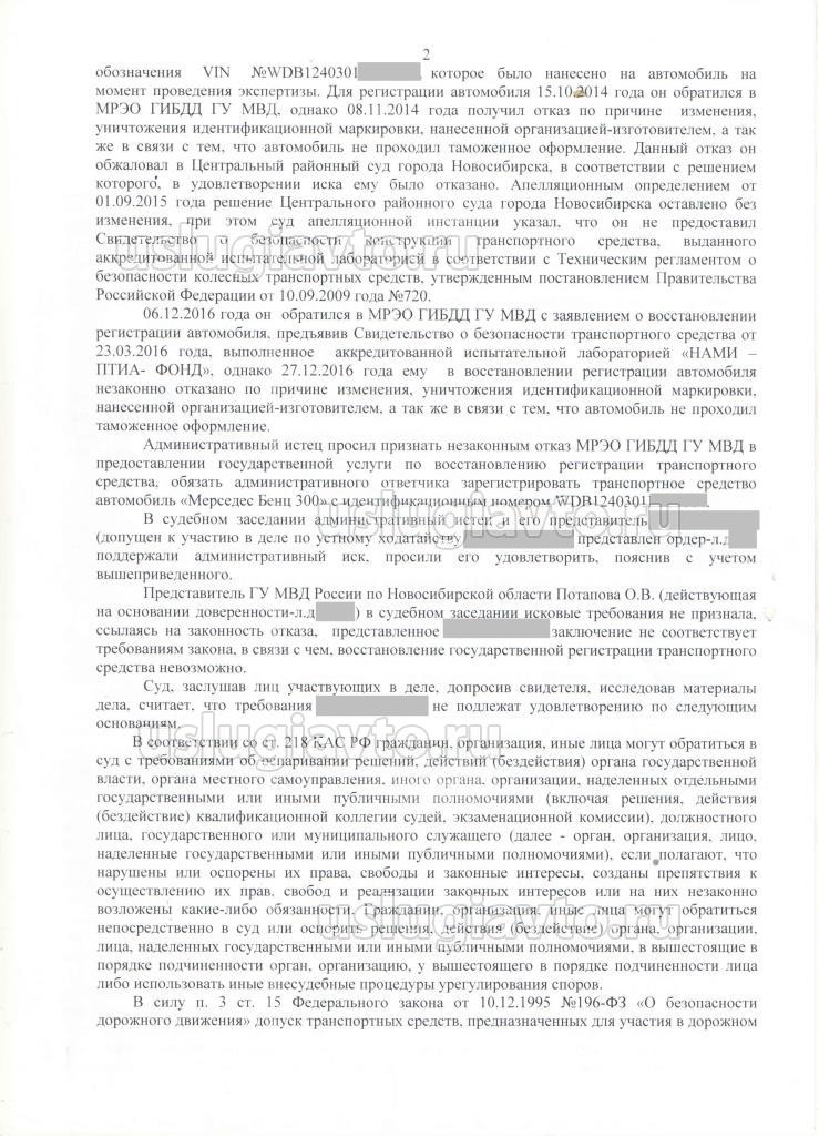 Ваше заявление, поступившее в Межрайонный отдел технического надзора и регистрации автомототранспортных средств Государственной инспекции безопасности дорожного движения №1 Главного Управления Министерства внутренних дел России по Новосибирской области, рассмотрено. Сообщаем Вам, что на аналогичное Ваше обращение в 2014 году по вопросу восстановления регистрации принадлежащего Вам автомобиля МЕРСЕДЕС БЕНЦ 300, 08.11.2014 за исх.№ ХХХ Вам уже было отказано в предоставлении государственной услуги. Повторно разъясняем Вам, что порядок регистрации транспортных средств определен правилами регистрации автомототранспортных средств и прицепов к ним в Государственной инспекции безопасности дорожного движения Министерства внутренних дел Российской Федерации, утвержденными приказом Министерства внутренних дел Российской Федерации от 24.11.2008 № 1001 (далее Правил), а последовательность административных процедур (действий) должностных лиц по предоставлению государственной услуги по регистрации автотранспортных средств и прицепов к ним, определяет Административный регламент Министерства внутренних дел Российской Федерации, утвержденный