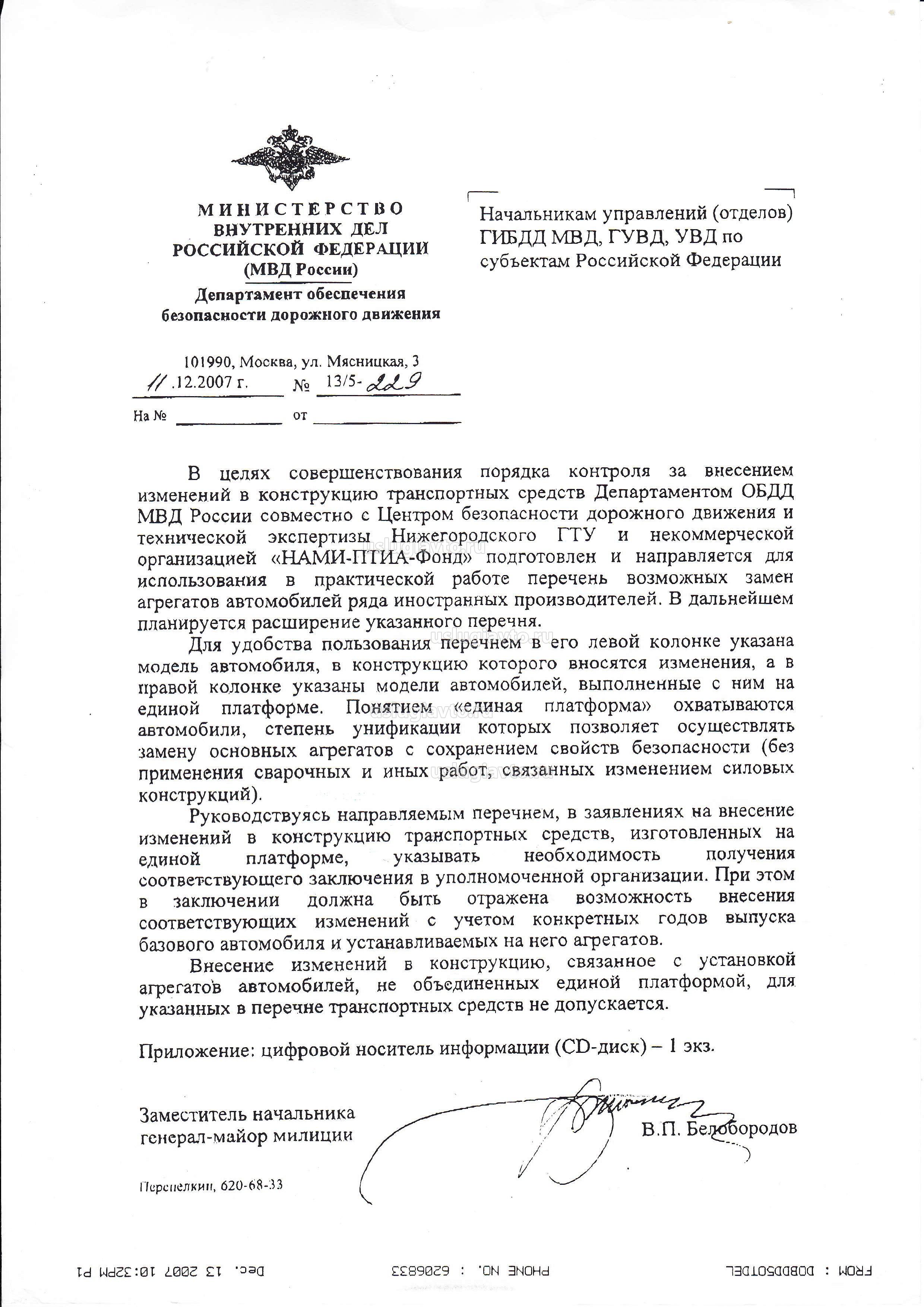 Здравствуйте. Подскажите, пожайлуста, отменено ли письмо ДОБДД МВД России от 11.12.2007г. №13/5-229 с приложением допустимых замен кузовов, если отменено то на основании чего!?