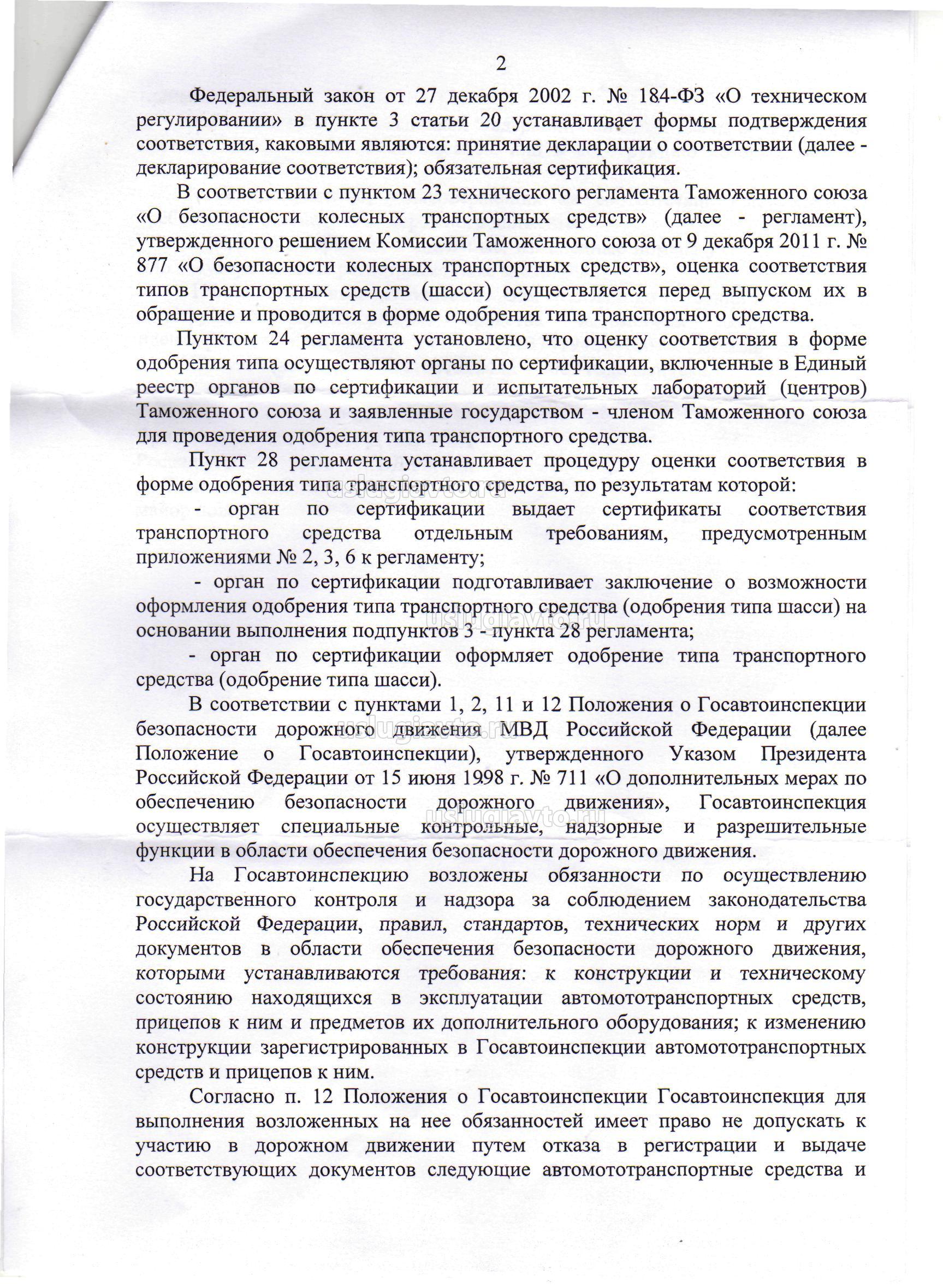 Доброго времени суток. Хочу переоборудовать УАЗ 374194 (грузовой) в бортовой автомобиль. Обратился к Вам и получил от Вас Заключение предварительной технической экспертизы конструкции транспортного средства. Далее 27 августа 2015 года обратился в ГАИ МО МВД России "Асиновский" (Томская область) с заявлением о рассмотрении вопроса переоборудования, представив ПТС, СОР ТС, Заключение и сам автомобиль. Инспектор осмотрел автомобиль, ппровел сверку всех номерных агрегатов и начал изучать документы, прочитав заключение, заявил, что якобы в его списке данной организации нет и можете его выкинуть (но дело не об этом), в итоге заявил, что в этот день не может вынести по моему вопросу решение и ему нужно советоваться со специалистами областного ГАИ, каких либо отметок в заявлении инспектор вообще не сделал. В конечном итоге сегодня я получил письменный отказ. В областном ГАИ сказали, что также не разрешат данное переоборудование. Все документы во вложении. Что теперь делать, подскажите пожалуйта куда обращаться, т.к. я с их решением не согласен. Заранее спасибо.
