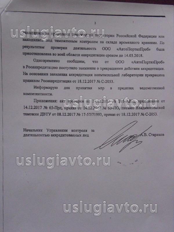 Ну и на "вкусненькое" приложили Письмо о прекращении аккредитации ООО АвтоПорталПроб в декабре 2017 г.
