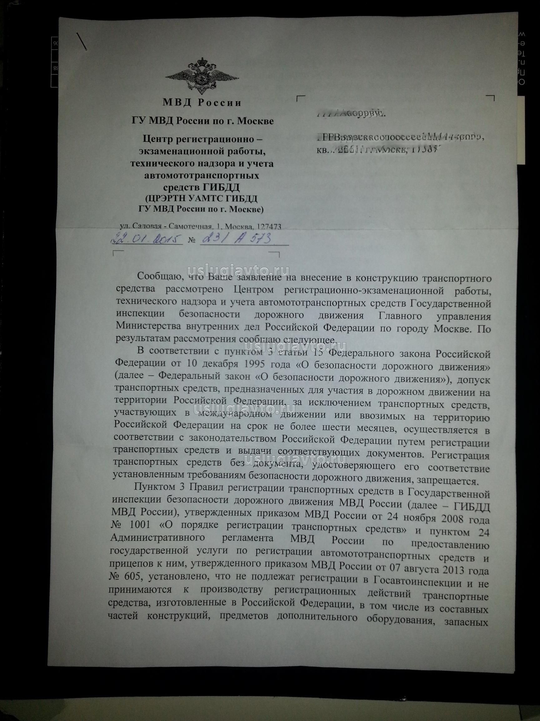 Рассмотрение заявления на внесение изменений в конструкцию т/с, регламентируется приказом МВД 1240, а именно приложение № 2. Исходя из системного толкования порядка, действовавшего на момент вашего обращения, а именно в соответствии с п.п.4,5,6 следует, что при принятии заявления должностное лицо удостоверяется в отсутствии запретов или ограничений наложенных соответствующими органами на конкретно рассматриваемое т/с. В случае отсутствия ограничений, должностное лицо принимает