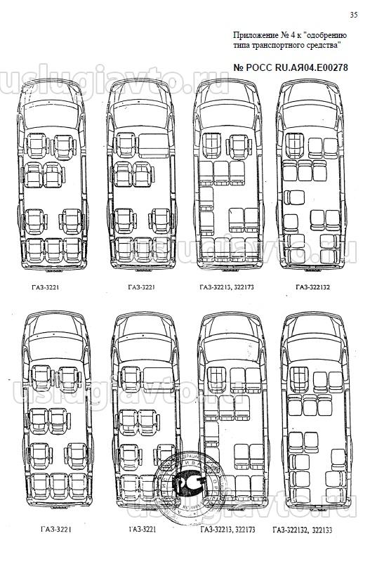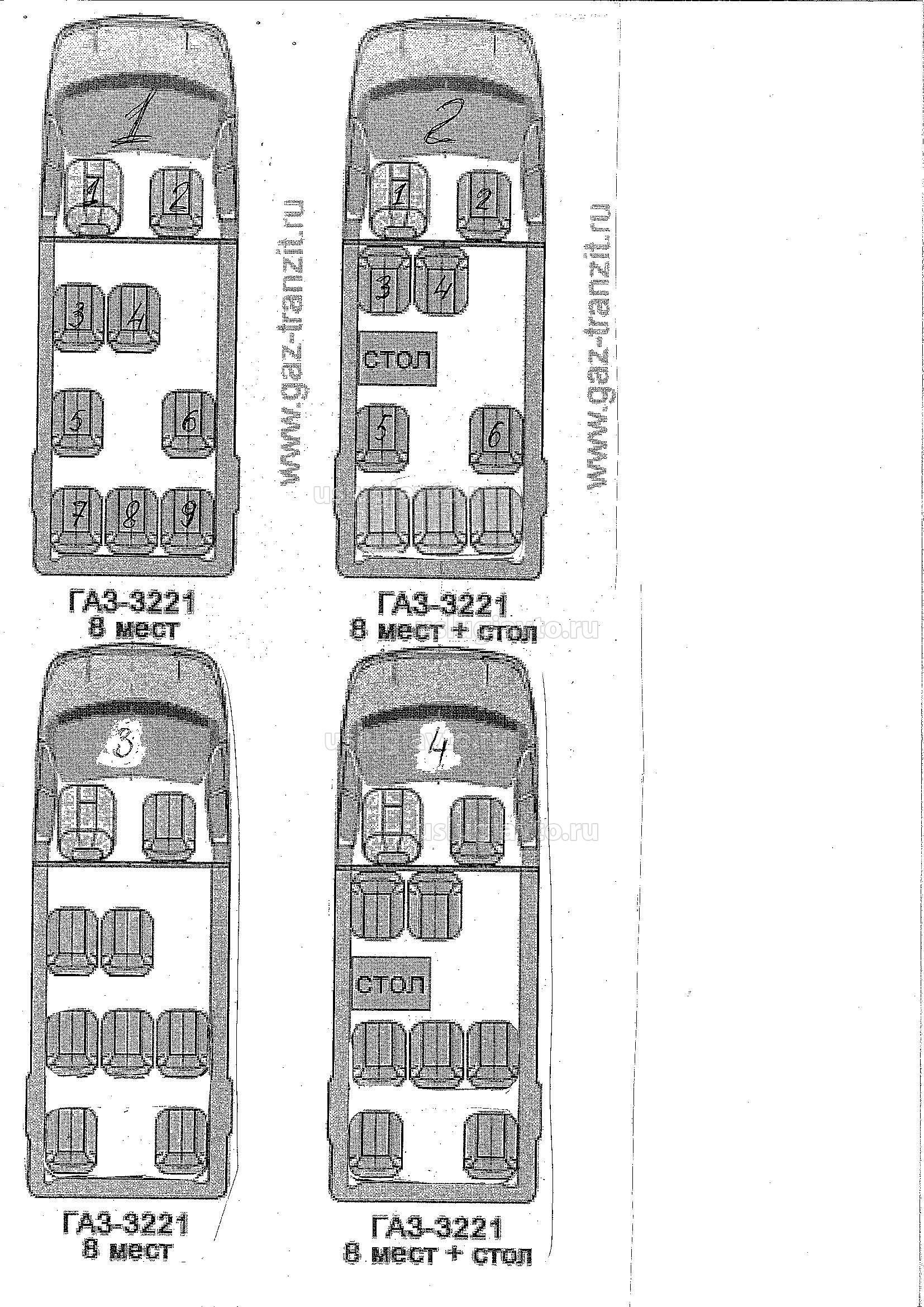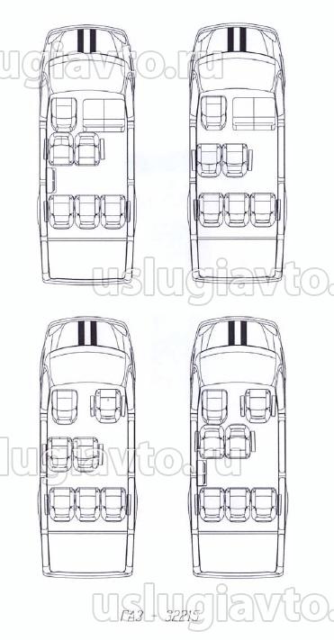 На ГАЗ-3221 предусматривались варианты компоновки сиденьями салона и столиком- приложение. В принципе вариант № 4, где сиденья 3 и 4 ряда меняются местами, на штатных креплениях, предусмотрено заводом, крепления совпадают и доступом к 4 ряду через заднюю дверь- меня вполне устраивает. Особенно если временно снять 2 последних сиденья. Но это выслали мне по интернету, не документ. Старожилы говорят, что ранее (90е годы, начало 2000х) в инструкциях по эксплуатации и альбомах прямо указывались на схемах такие варианты. Но найти такой альбом или инструкцию не могу для демонстрации ГИБДД на постах. А в современных инструкциях (на предприятии только что приобрели ГАЗ-3221люкс 8+1 место, без столика) вообще всё скудно, тоненькая брошюрка, вообще нет подобных схем.