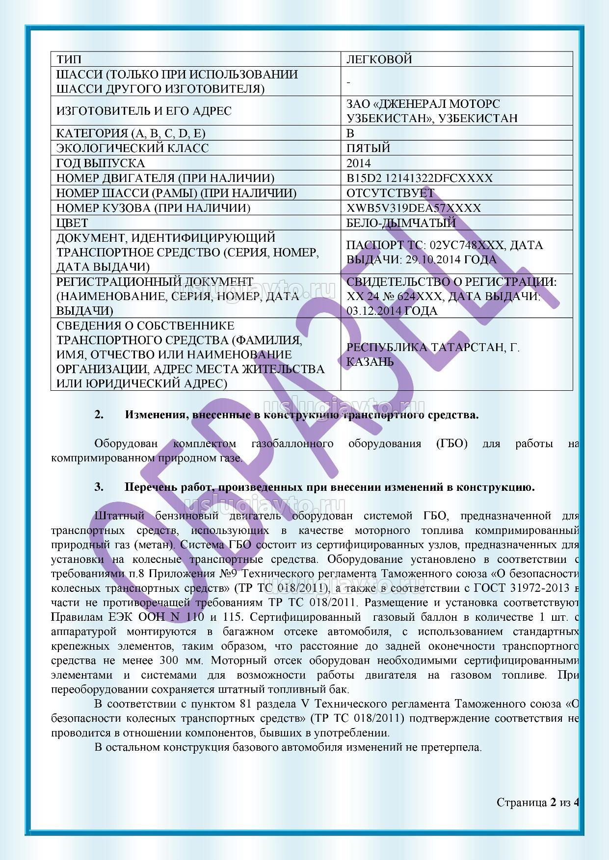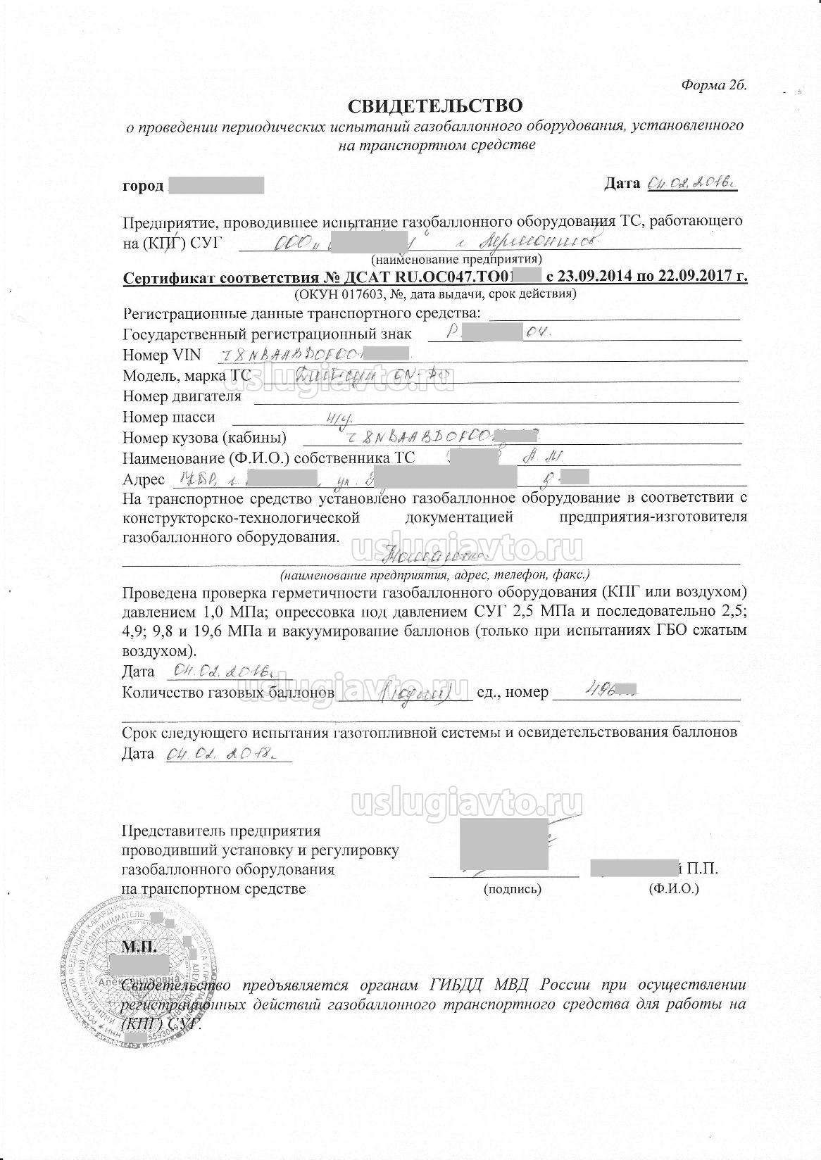 - декларацию производителя работ по внесению изменений в конструкцию транспортного средства о выполнении работ в соответствии с установленными правилами, проверке герметичности и опрессовке системы питания, о проведении периодических испытаний оборудования для питания двигателя газообразным топливом и о соответствии предельно допустимого содержания оксида углерода (СО) в отработавших газах транспортного средства требованиям приложения № 8 к настоящему техническому регламенту.