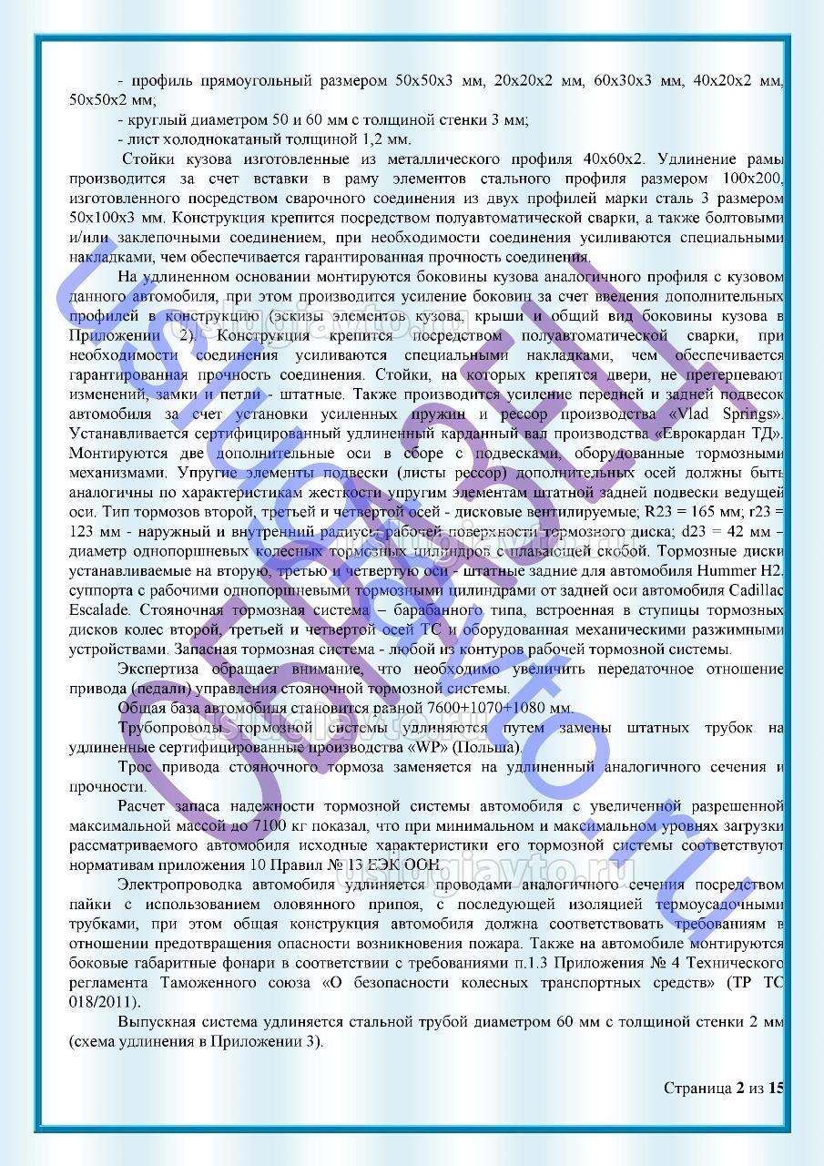 Образец Заключение на переоборудование Hummer H2 путем удлинения колесной базы, увеличение массы и установки дополнительных осей (4-х осный) "Лимузин" стр 2