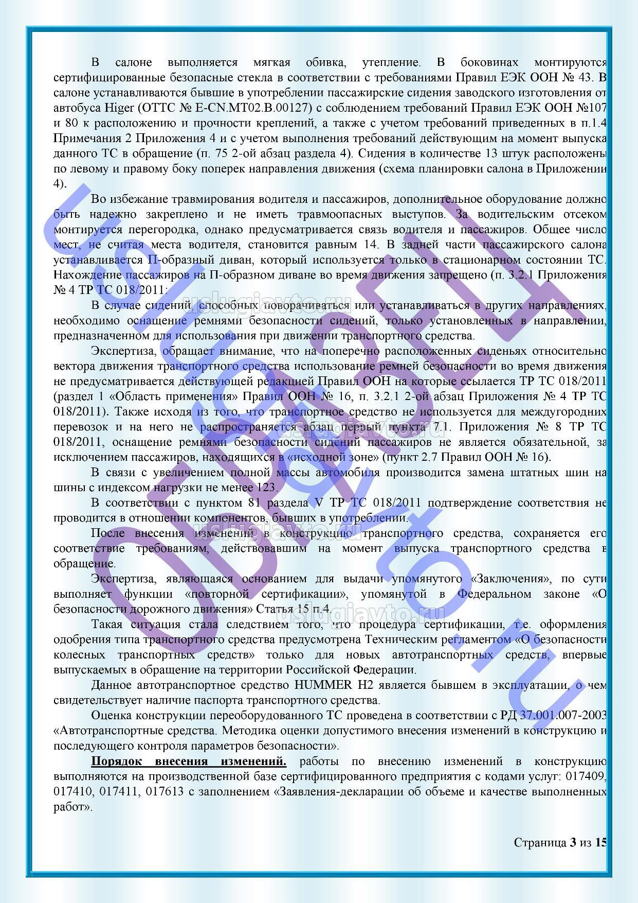 Образец Заключение на переоборудование Hummer H2 путем удлинения колесной базы, увеличение массы и установки дополнительных осей (4-х осный) "Лимузин" стр 3