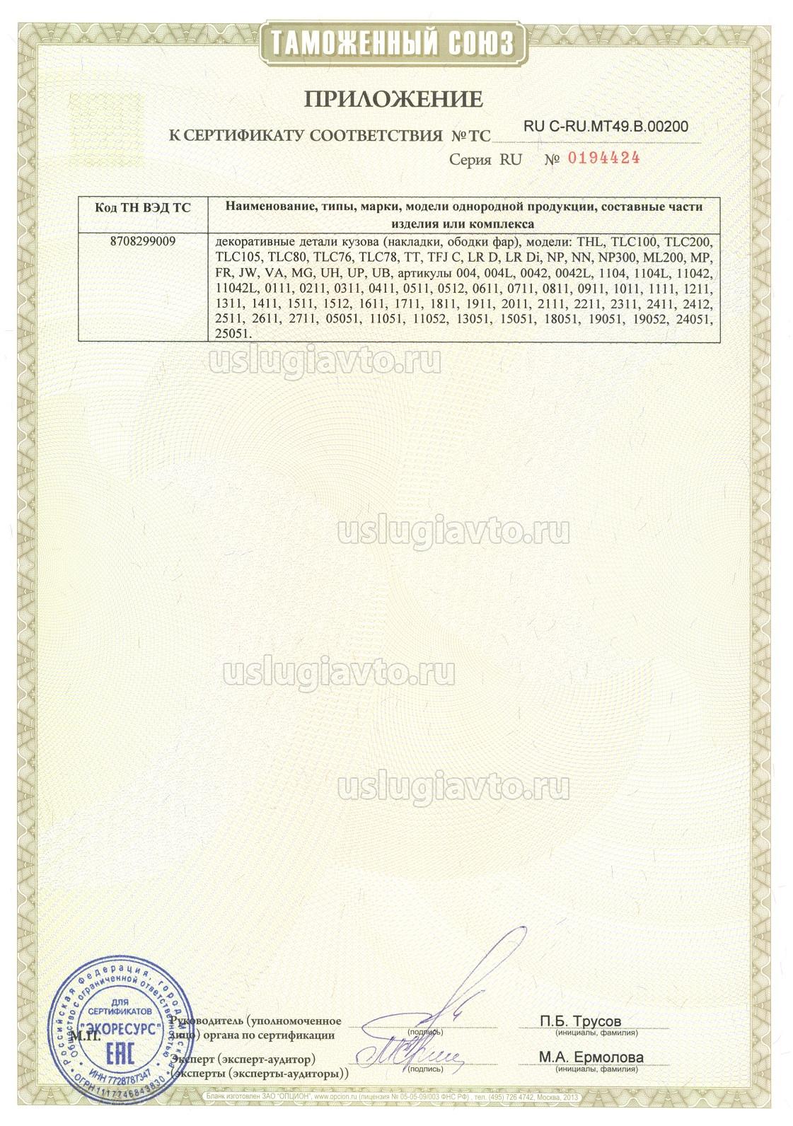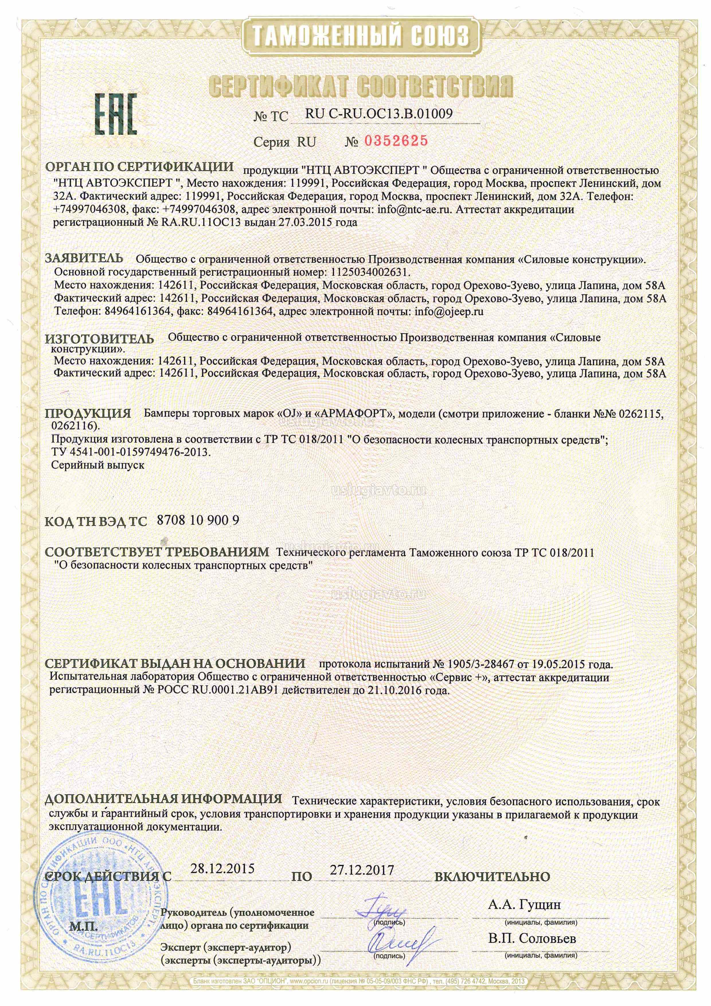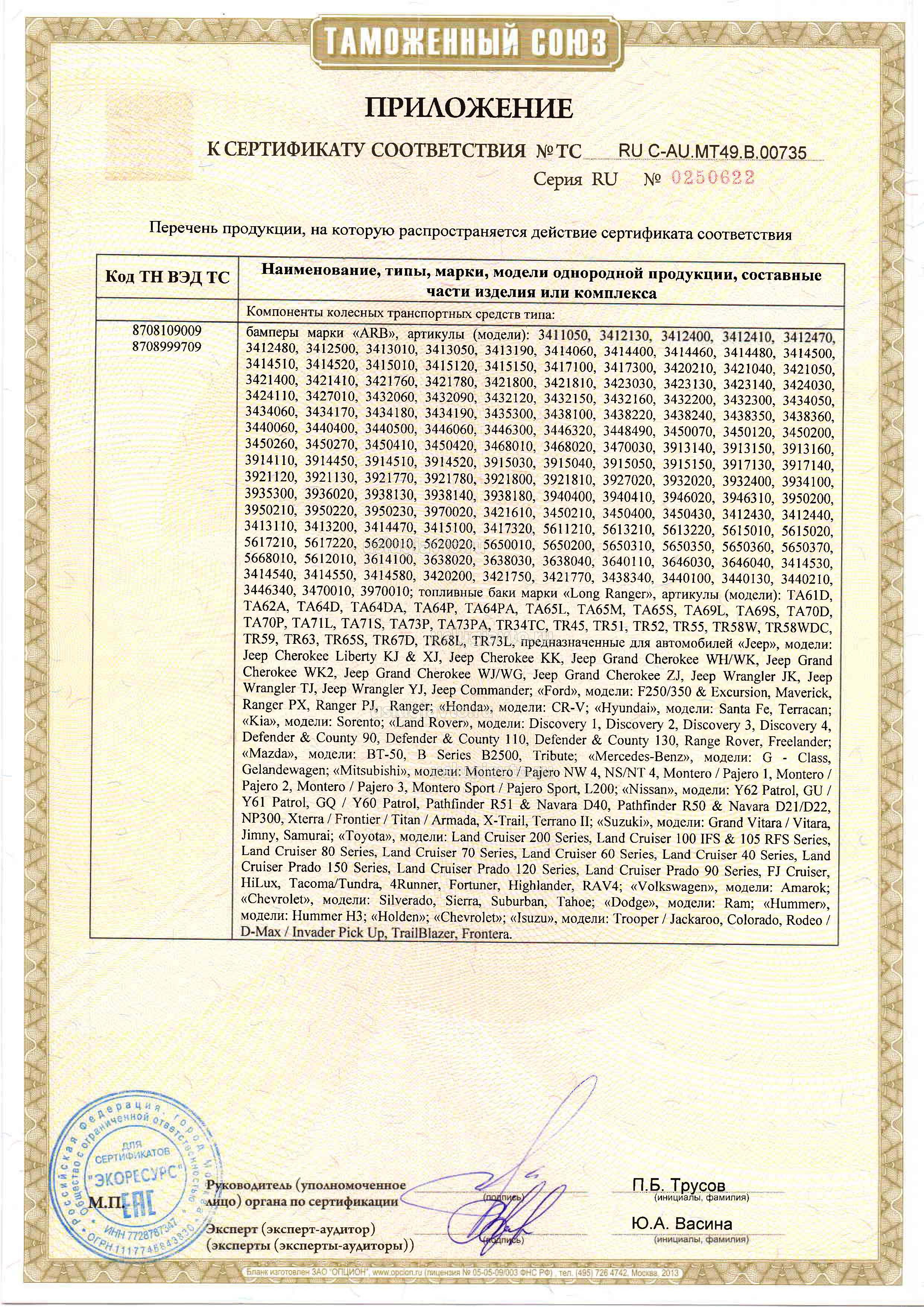 - Сертификат № TC RU C-AU.MT14.B.00967 на продукцию "Запасные части по каталогу "ARB 4x4 Accessories", изготовителя "ARB Corporation Ltd."", серийный выпуск.