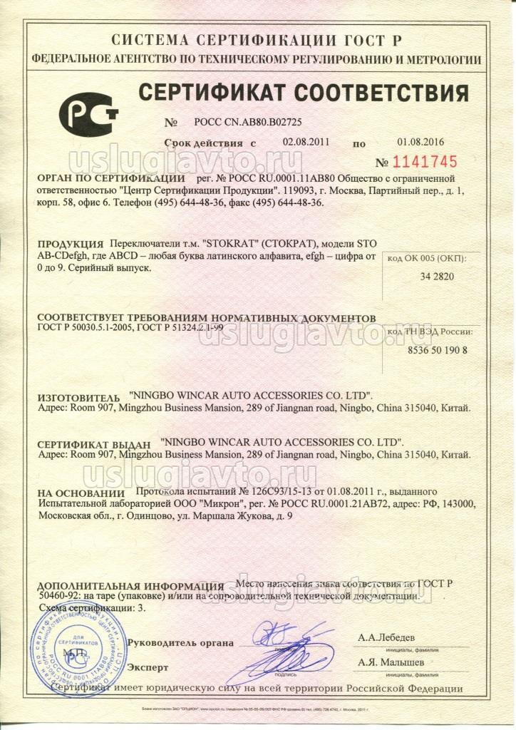Сертификат № РОСС CN.АВ80.В02725 на продукцию "Переключатели т.м. "STOKRAT" (СТОКРАТ), изготовителя "NINGBO WINCAR AUTO ACCESSORIES СО. LTD"", серийный выпуск