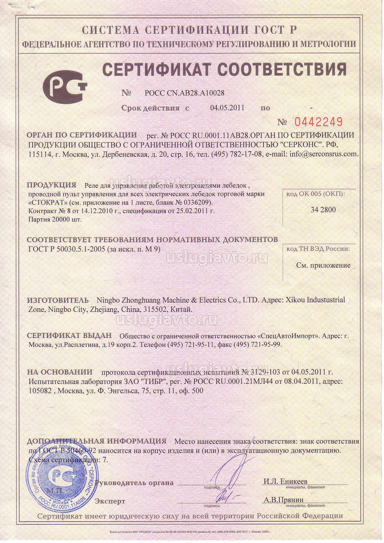 Сертификат № РОСС CN.АВ25.А10028 на продукцию "еле для управления работой электроцепями лебедок , проводной пульт управления для всех электрических лебедок торговой марки «СТОКРАТ», изготовителя Ningbo Zhonghuang Machine & Electrics Co.", партия 20000 шт.