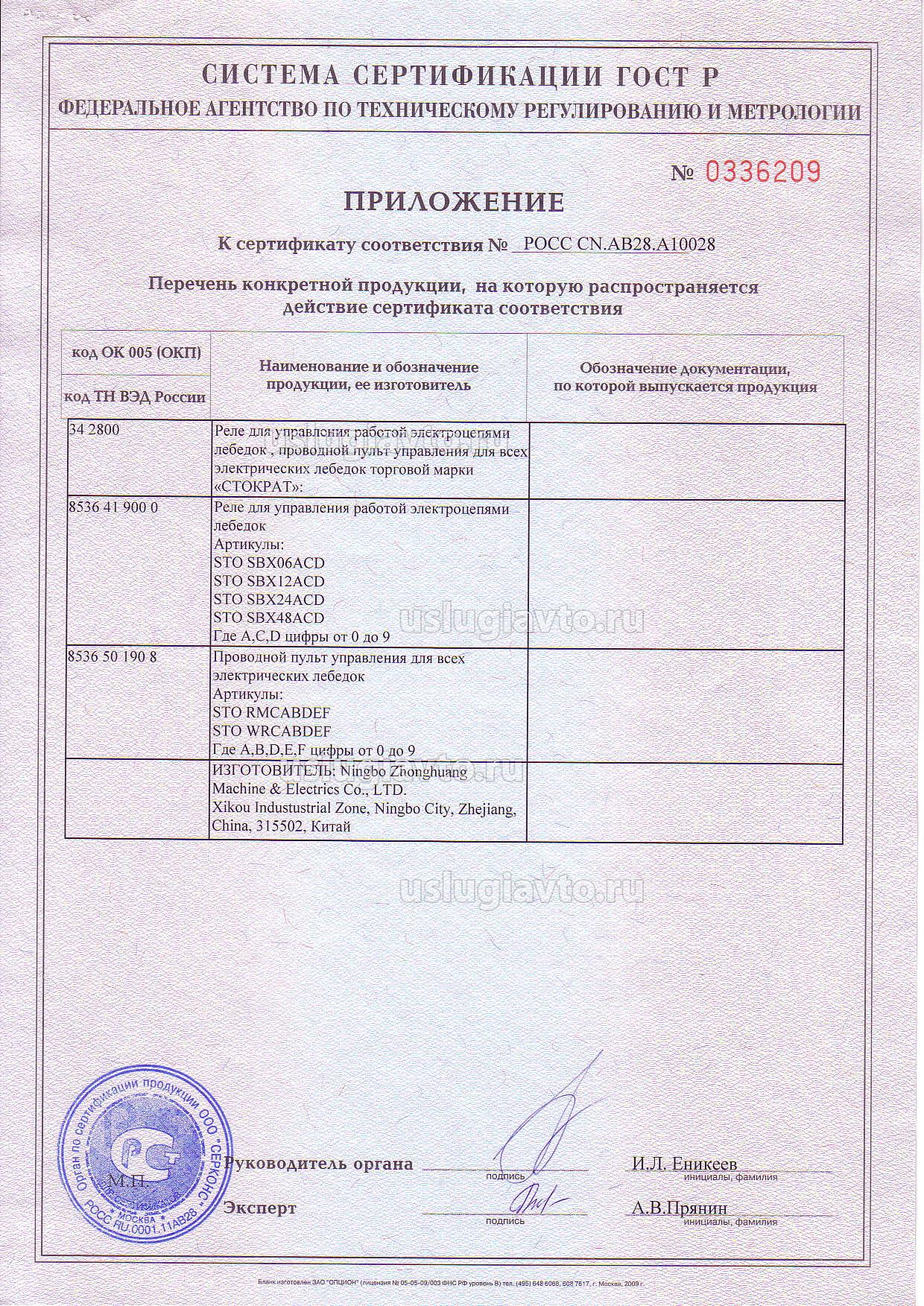 Приложение к сертификату № РОСС CN.АВ25.А10028 на продукцию "еле для управления работой электроцепями лебедок , проводной пульт управления для всех электрических лебедок торговой марки «СТОКРАТ», изготовителя Ningbo Zhonghuang Machine & Electrics Co.", партия 20000 шт.