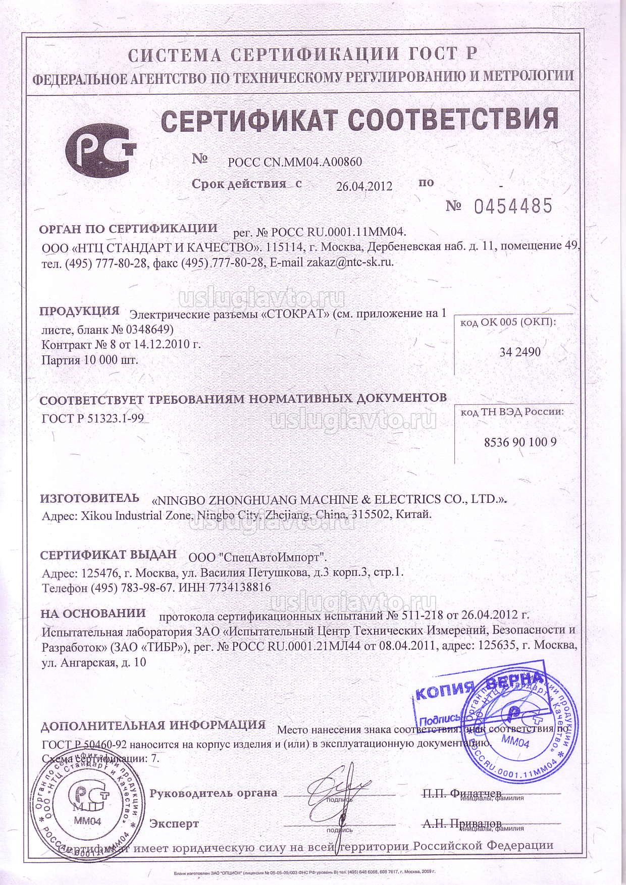 Сертификат № РОСС CN.MM04.A00860 на продукцию "Электрические разъемы «СТОКРАТ», изготовителя Ningbo Zhonghuang Machine & Electrics Co.", партия 10000 шт