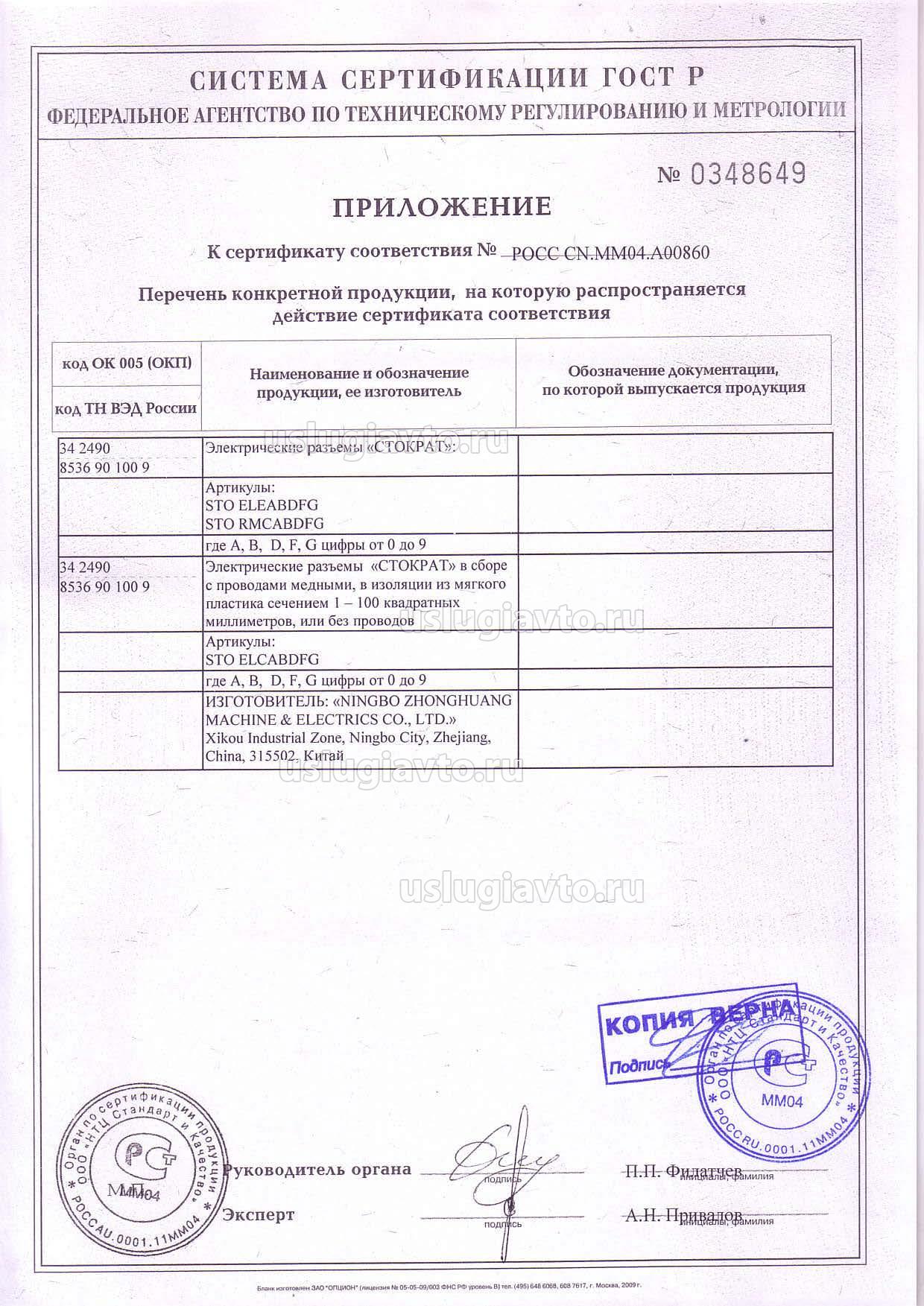 Приложение к сертификату № РОСС CN.MM04.A00860 на продукцию "Электрические разъемы «СТОКРАТ», изготовителя Ningbo Zhonghuang Machine & Electrics Co.", партия 10000 шт
