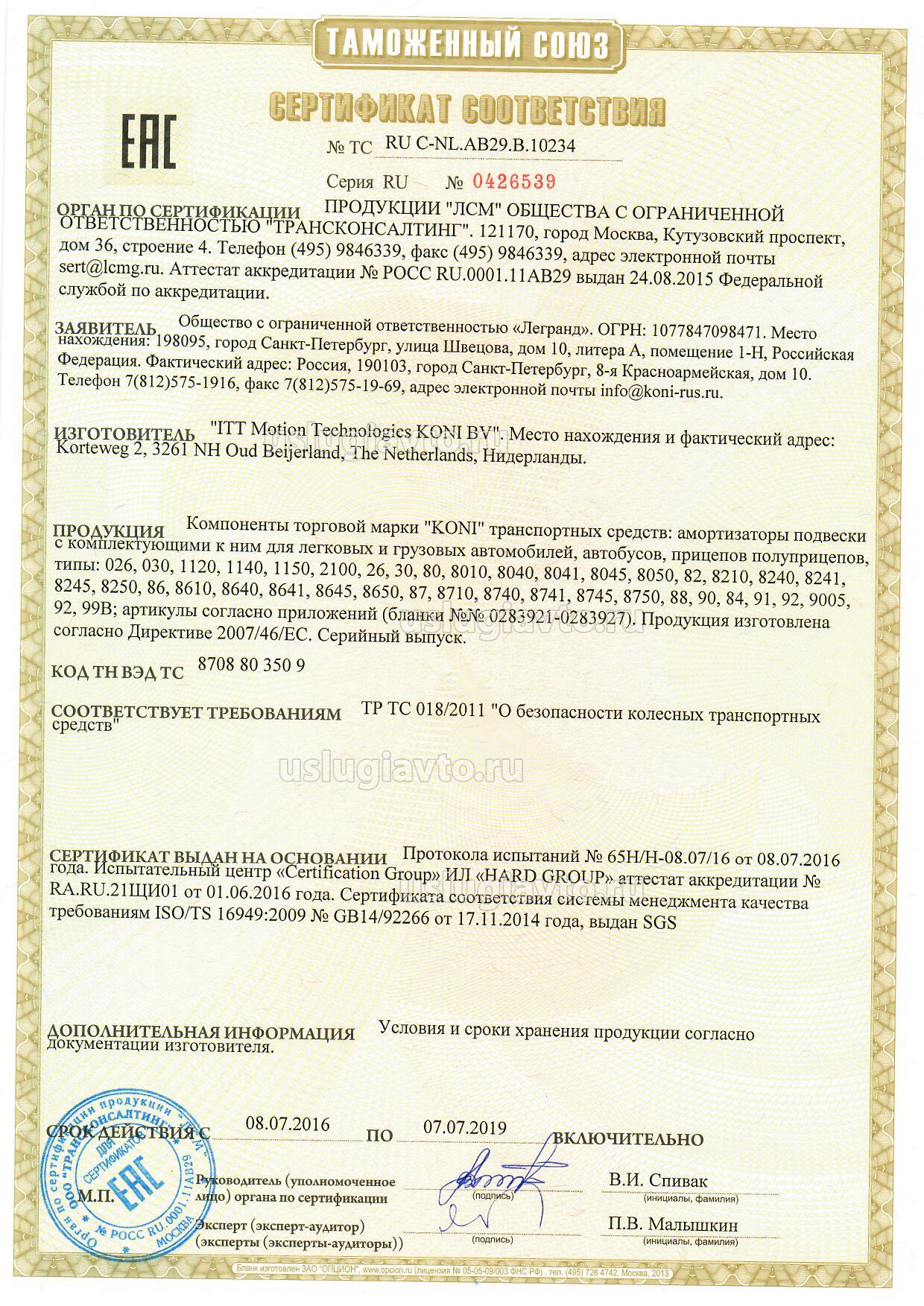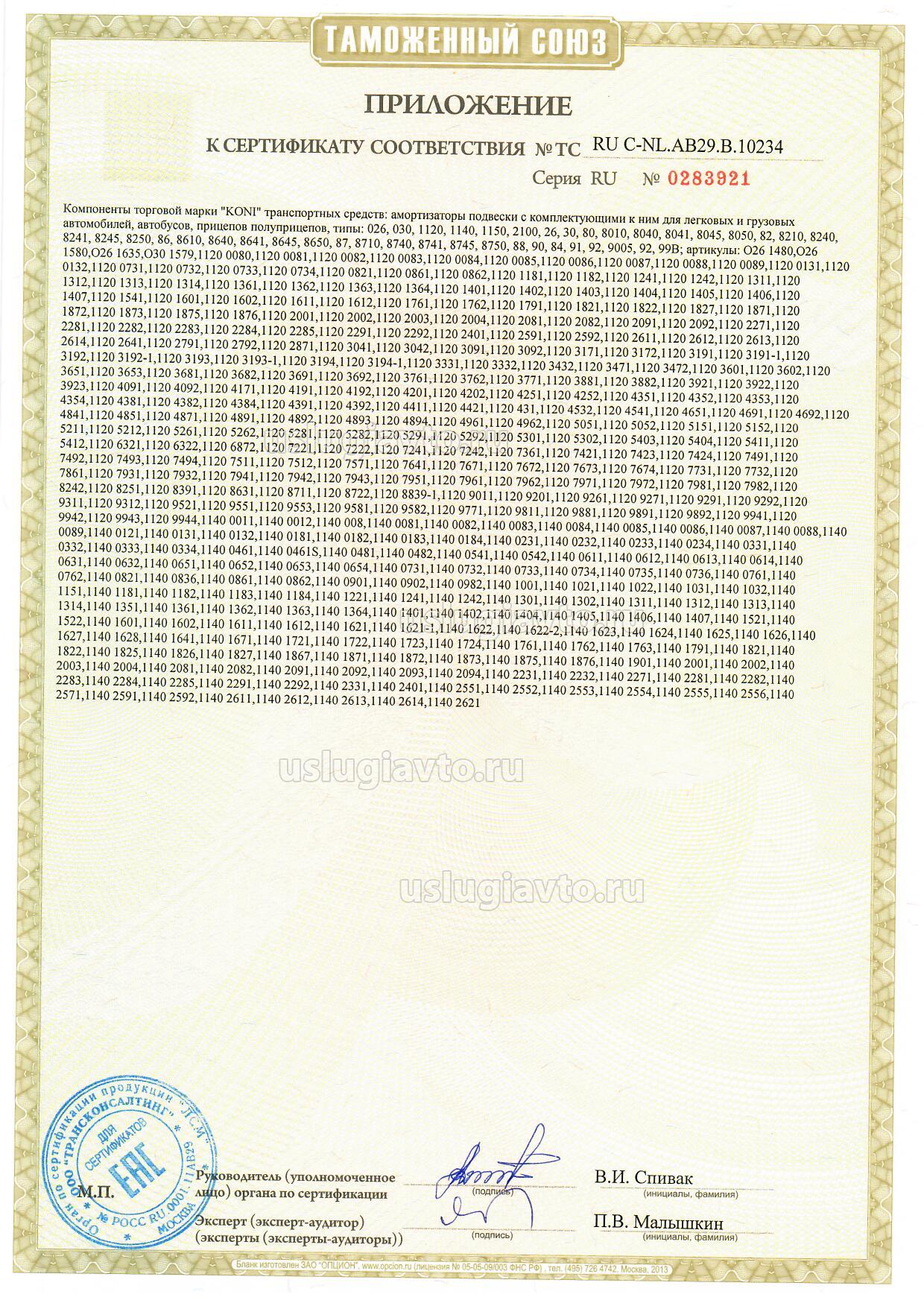 Компоненты торговой марки "KONI" транспортных средств: амортизаторы подвески с комплектующими к ним для легковых и грузовых автомобилей, автобусов, прицепов полуприцепов, типы: 026, 030, 1120, 1140, 1150, 2100, 26, 30, 80, 8010, 8040, 8041, 8045, 8050, 82, 8210, 8240, 8241. 8245, 8250, 86, 8610, 8640, 8641, 8645, 8650, 87, 8710, 8740, 8741, 8745, 8750, 88, 90, 84, 91, 92, 9005, 92, 99В; артикулы согласно приложений (бланки №№ 0283921-0283927). Продукция изготовлена согласно Директиве 2007/46/ЕС. Серийный выпуск.