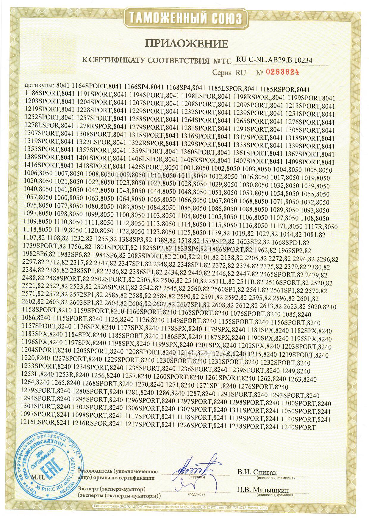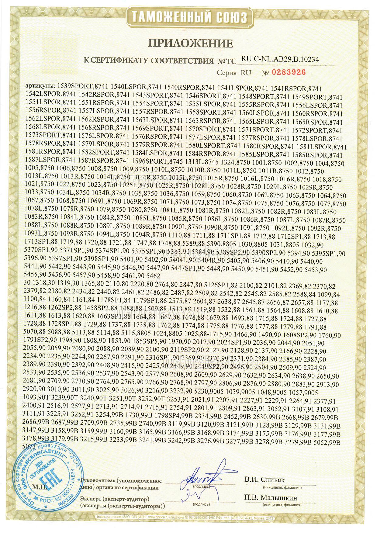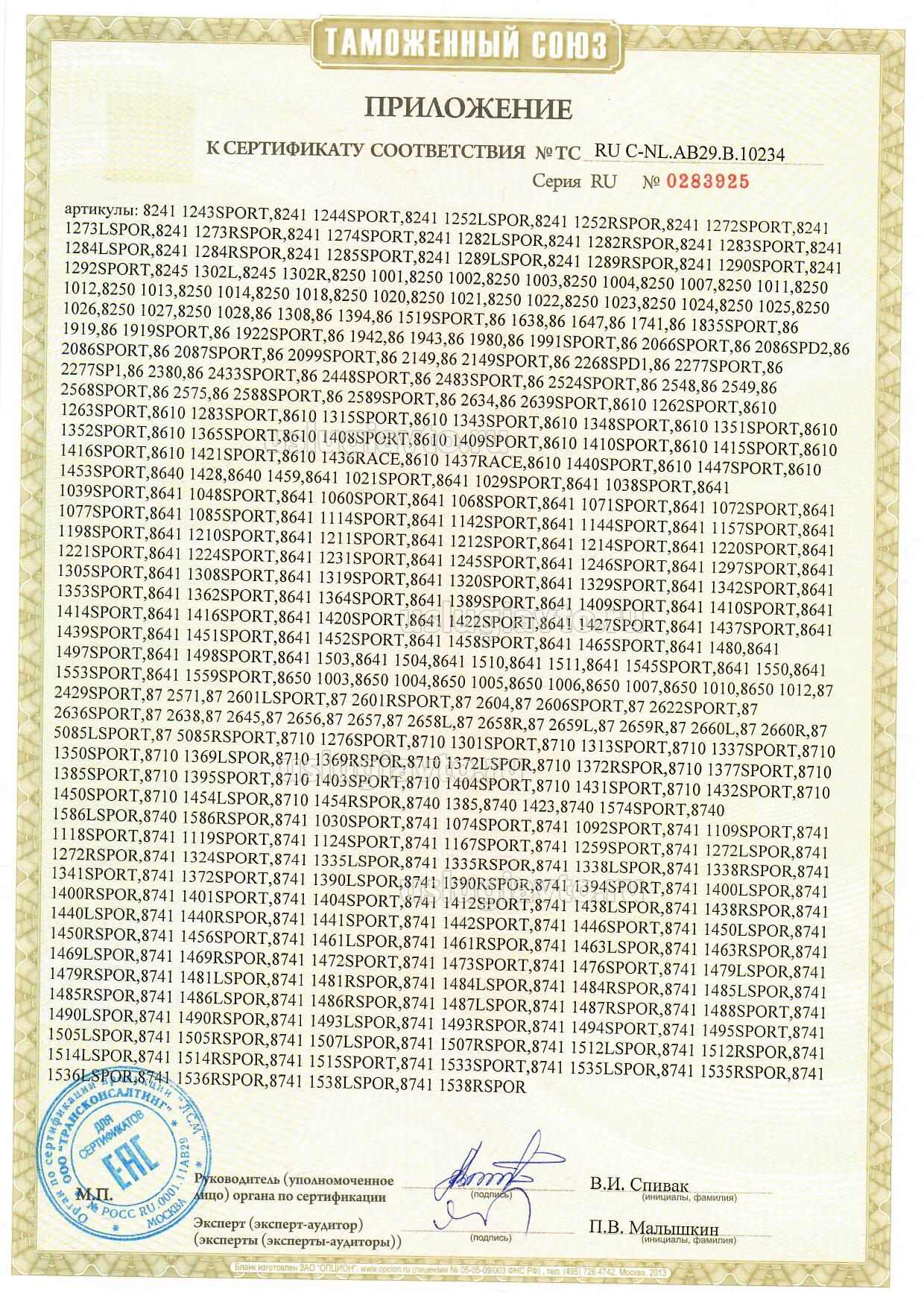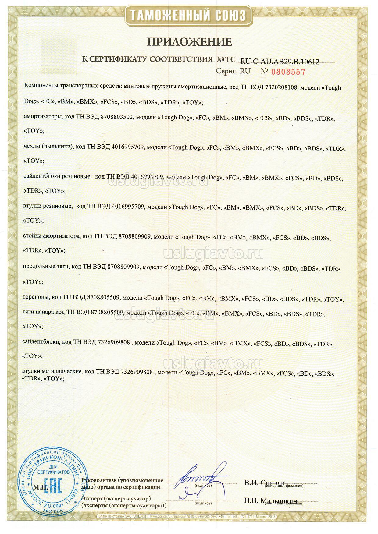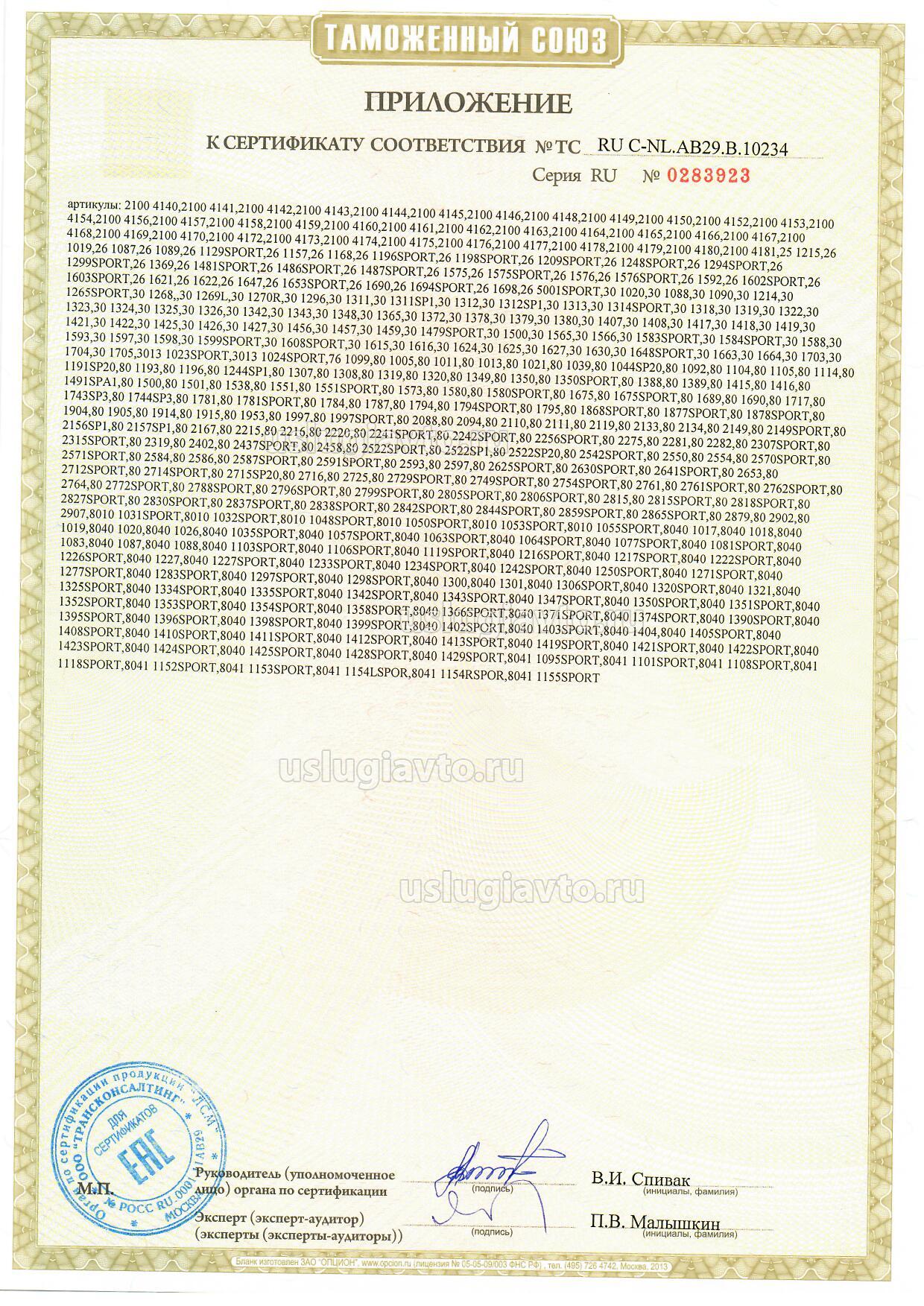 Компоненты транспортных средств: продукция и модели согласно приложениям (бланки №№ 0303557, 0303558). Продукция изготовлена согласно Директиве 2007/46/ЕС. Серийный выпуск.