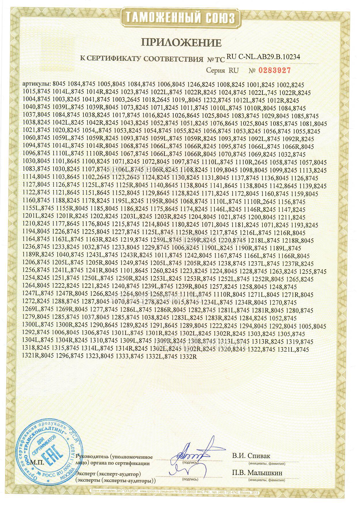 Приложение к сертификату № ТС RU C-AU.AB29.B.10612 на продукцию "Запасные части, применяемые для технического обслуживания и ремонта легковых автомобилей т.м. "SteelStaff", изготовителя "Union Eastern Gate Limited.", серийный выпуск_страница 1