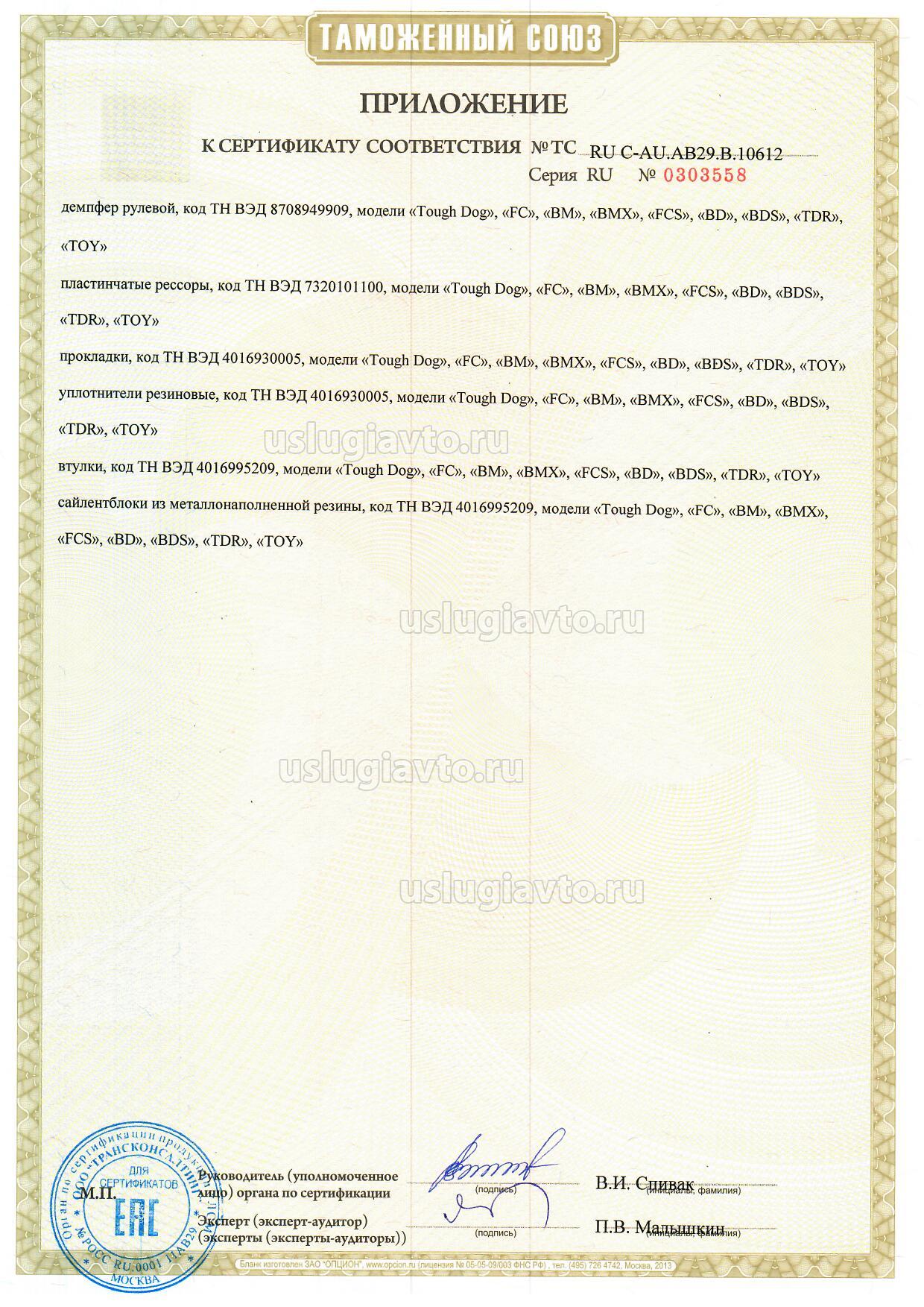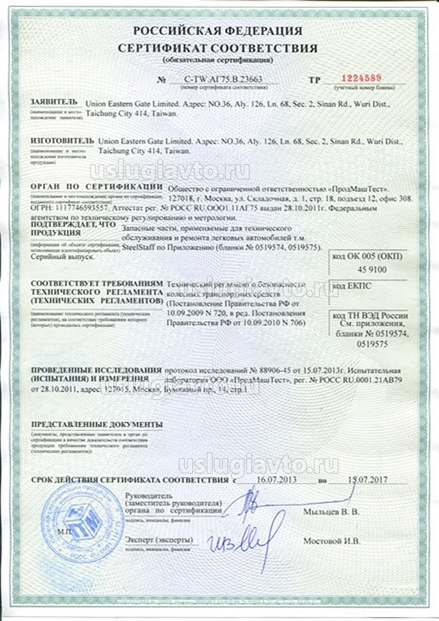 Сертификат № ТС RU C-AU.AB29.B.10612 на продукцию "Запасные части, применяемые для технического обслуживания и ремонта легковых автомобилей т.м. "SteelStaff", изготовителя "Union Eastern Gate Limited.", серийный выпуск.