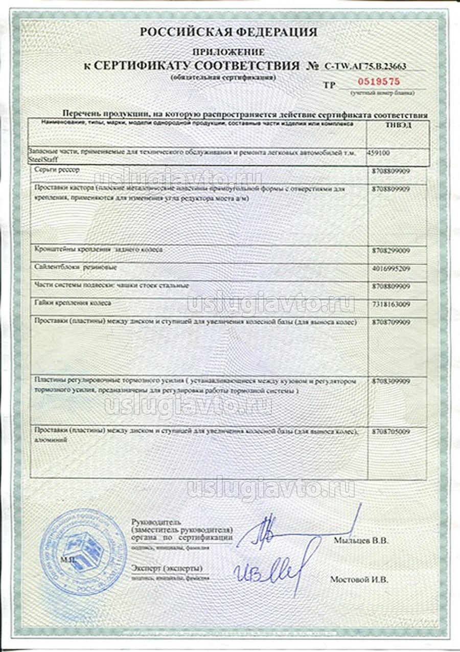 Сертификат № С-TW.АГ75.В.23663 на продукцию "Запасные части, применяемые для технического обслуживания и ремонта легковых автомобилей т.м. "SteelStaff", изготовителя "Union Eastern Gate Limited.", серийный выпуск.