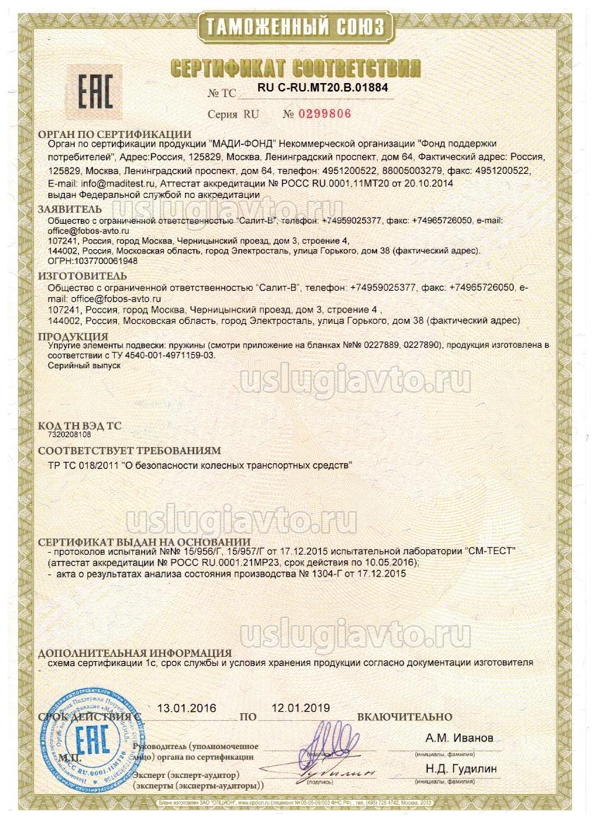 Сертификат № ТС RU C-RU.MT20.B.01884 на продукцию "Упругие элементы подвески: пружины, изготовителя "Салит-В ", серийный выпуск.