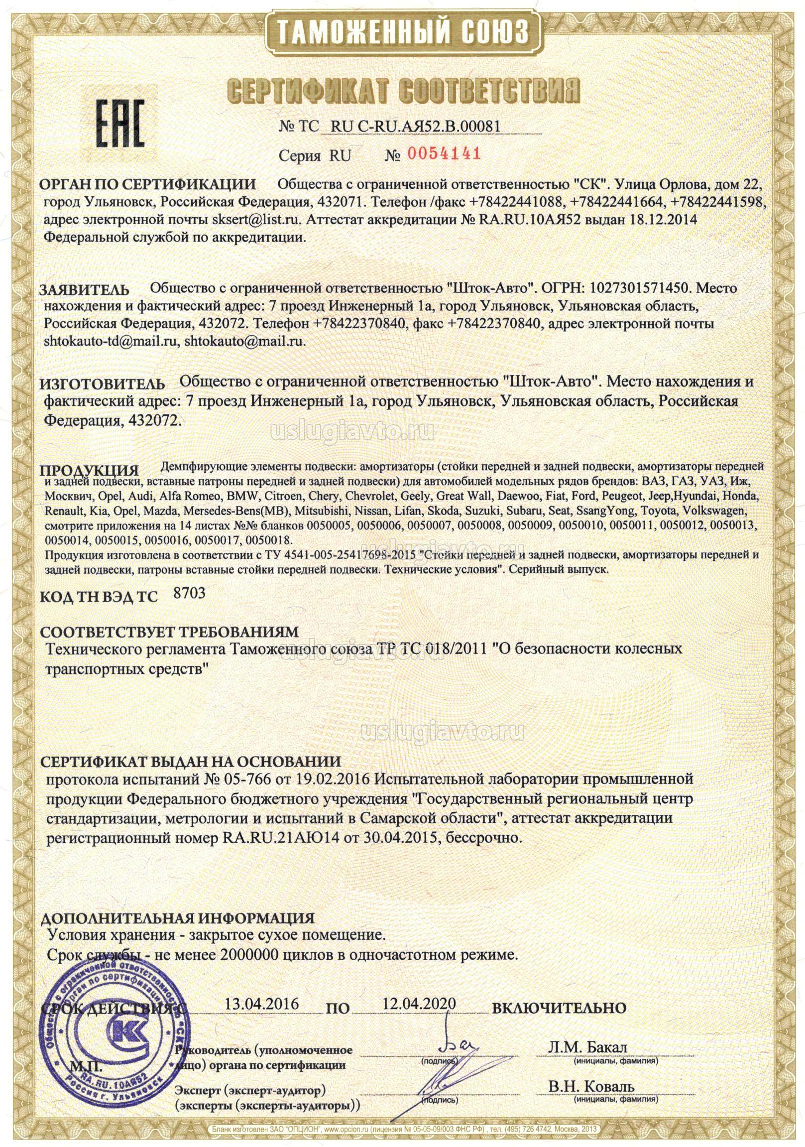 Сертификат № ТС RU C-RU.АЯ52.В.00081 на продукцию "Демпфирующие элементы подвески: амортизаторы, изготовителя ООО "Шток-Авто", серийный выпуск
