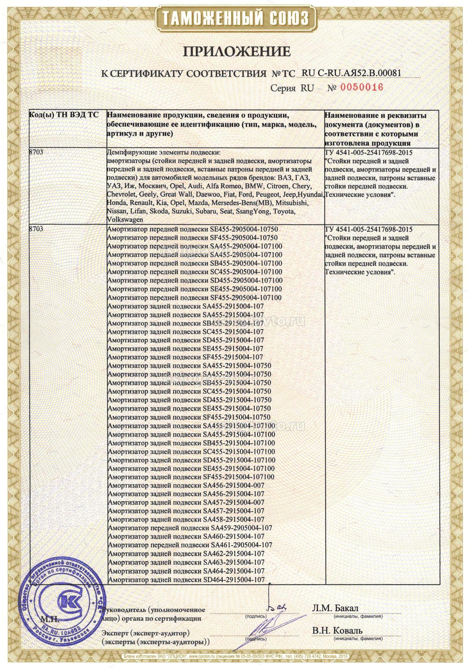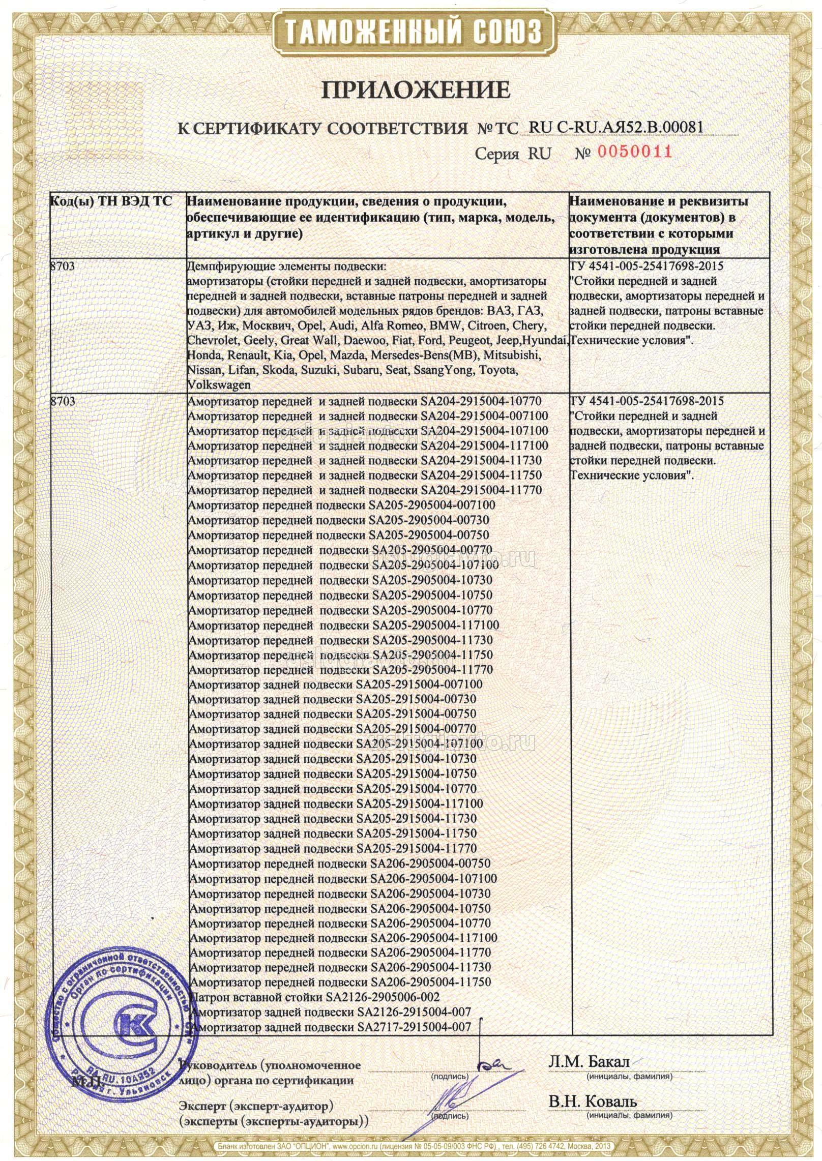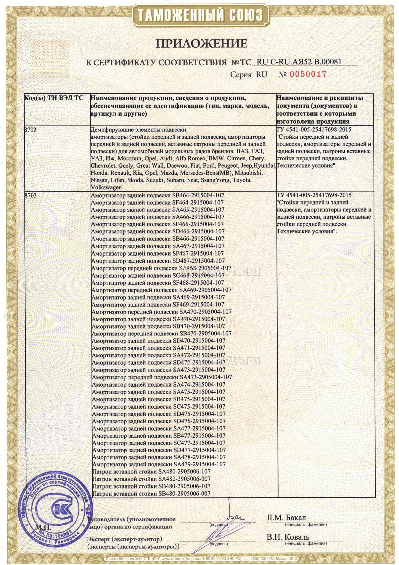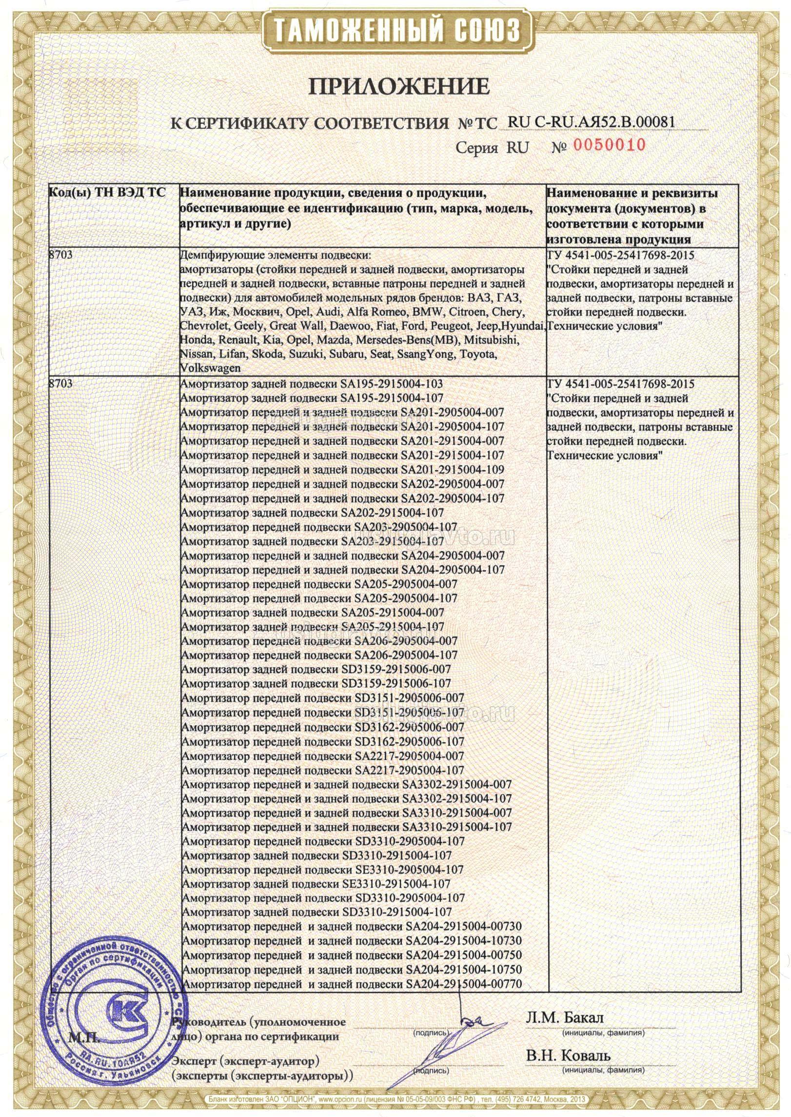 Демпфирующие элементы подвески: амортизаторы (стойки передней и задней подвески, амортизаторы передней и задней подвески, вставные патроны передней и задней подвески) для автомобилей модельных рядов брендов: ВАЗ, ГАЗ, УАЗ, Иж, Москвич, Opel, Audi, Alfa Romeo, BMW, Citroen, Chery, Chevrolet, Geely, Great Wall, Daewoo, Fiat, Ford, Peugeot, Jeep,Hyundai, Honda, Renault, Kia, Opel, Mazda, Mersedes-Bens(MB), Mitsubishi, Nissan, Lifan, Skoda, Suzuki, Subaru, Seat, SsangYong, Toyota, Volkswagen, смотрите приложения на 14 листах №№ бланков 0050005, 0050006,0050007, 0050008, 0050009, 0050010, 0050011,0050012,0050013, 0050014, 0050015, 0050016, 0050017, 0050018. Продукция изготовлена в соответствии с ТУ 4541-005-25417698-2015 "Стойки передней и задней подвески, амортизаторы передней и задней подвески, патроны вставные стойки передней подвески. Технические условия".