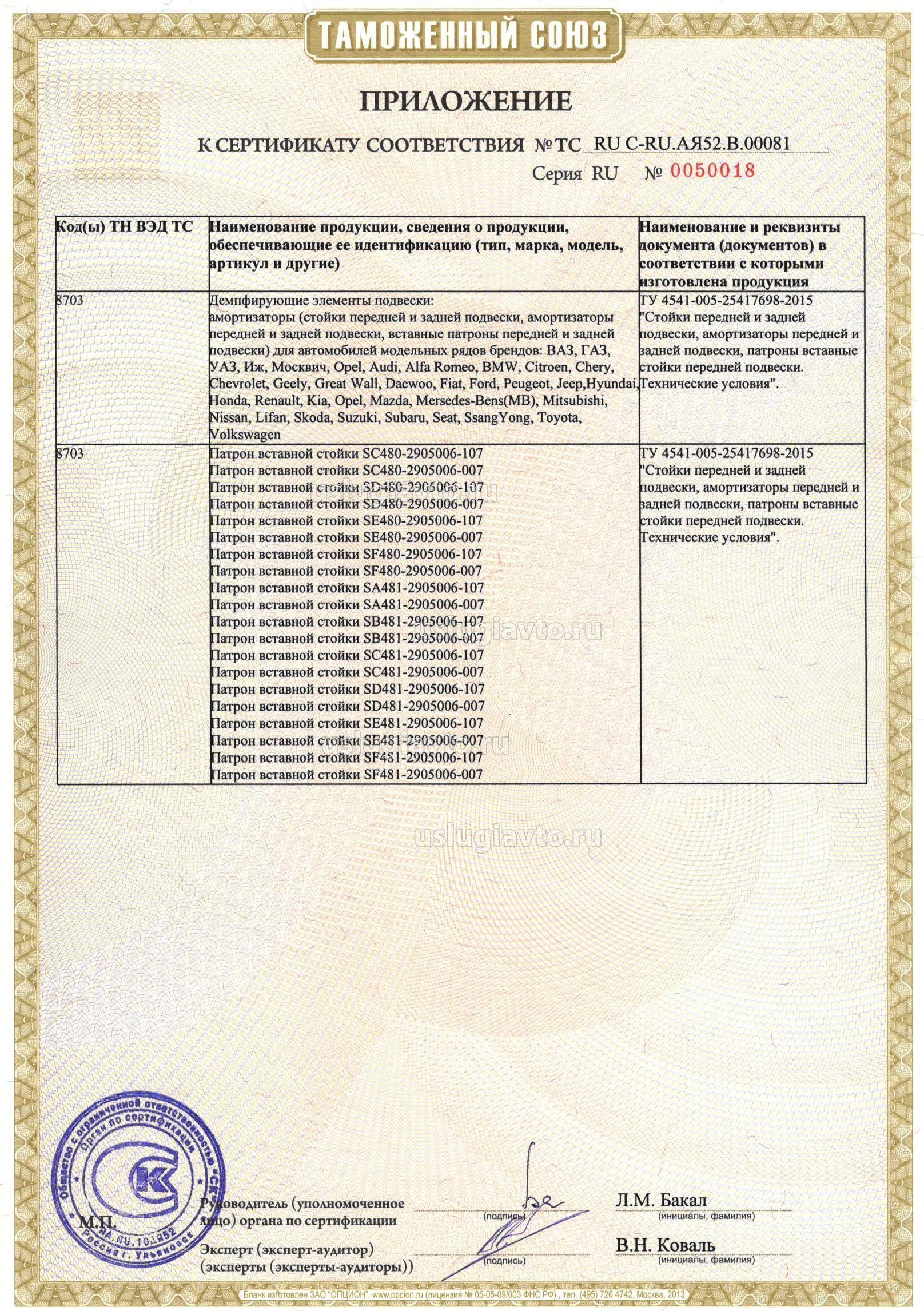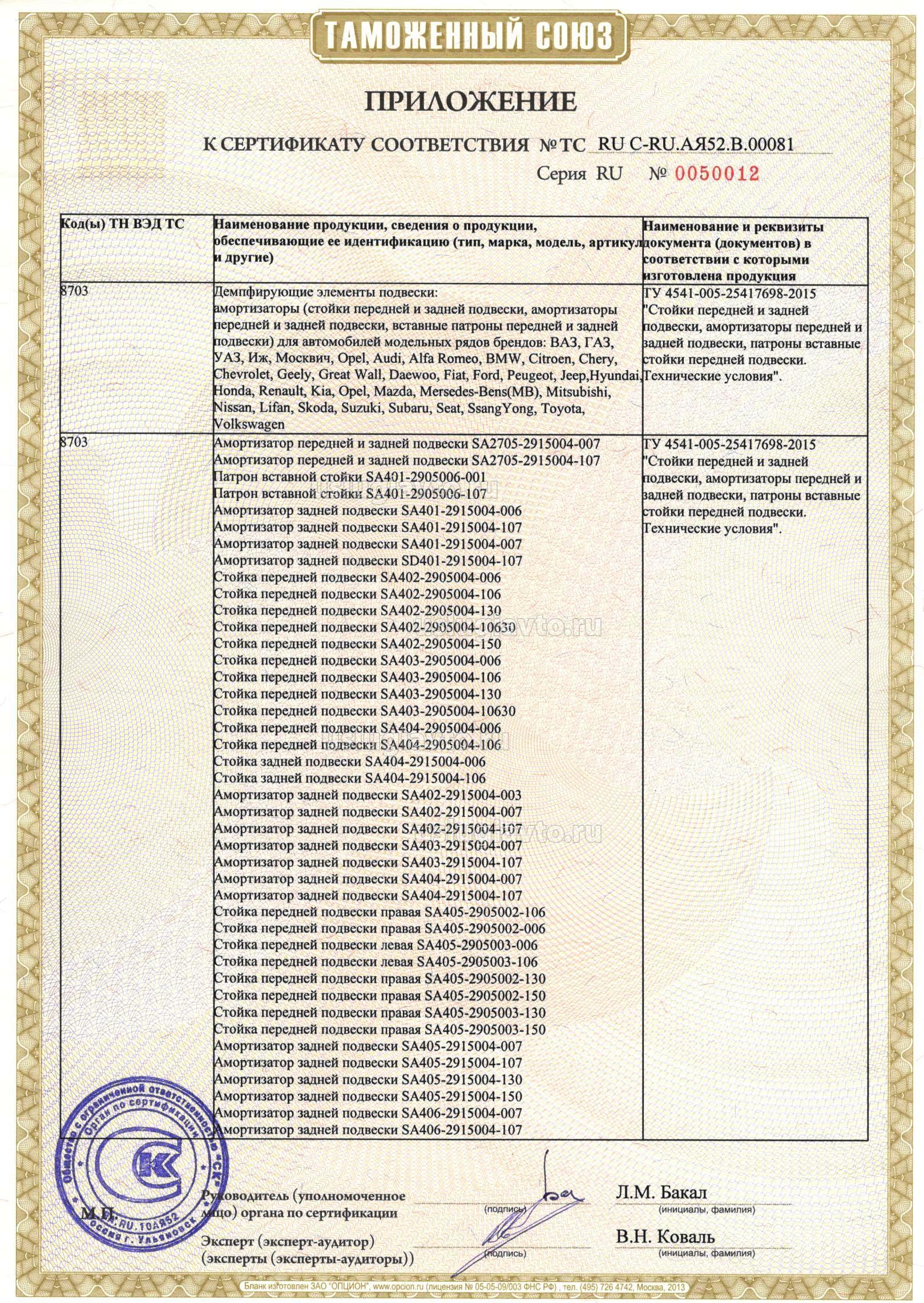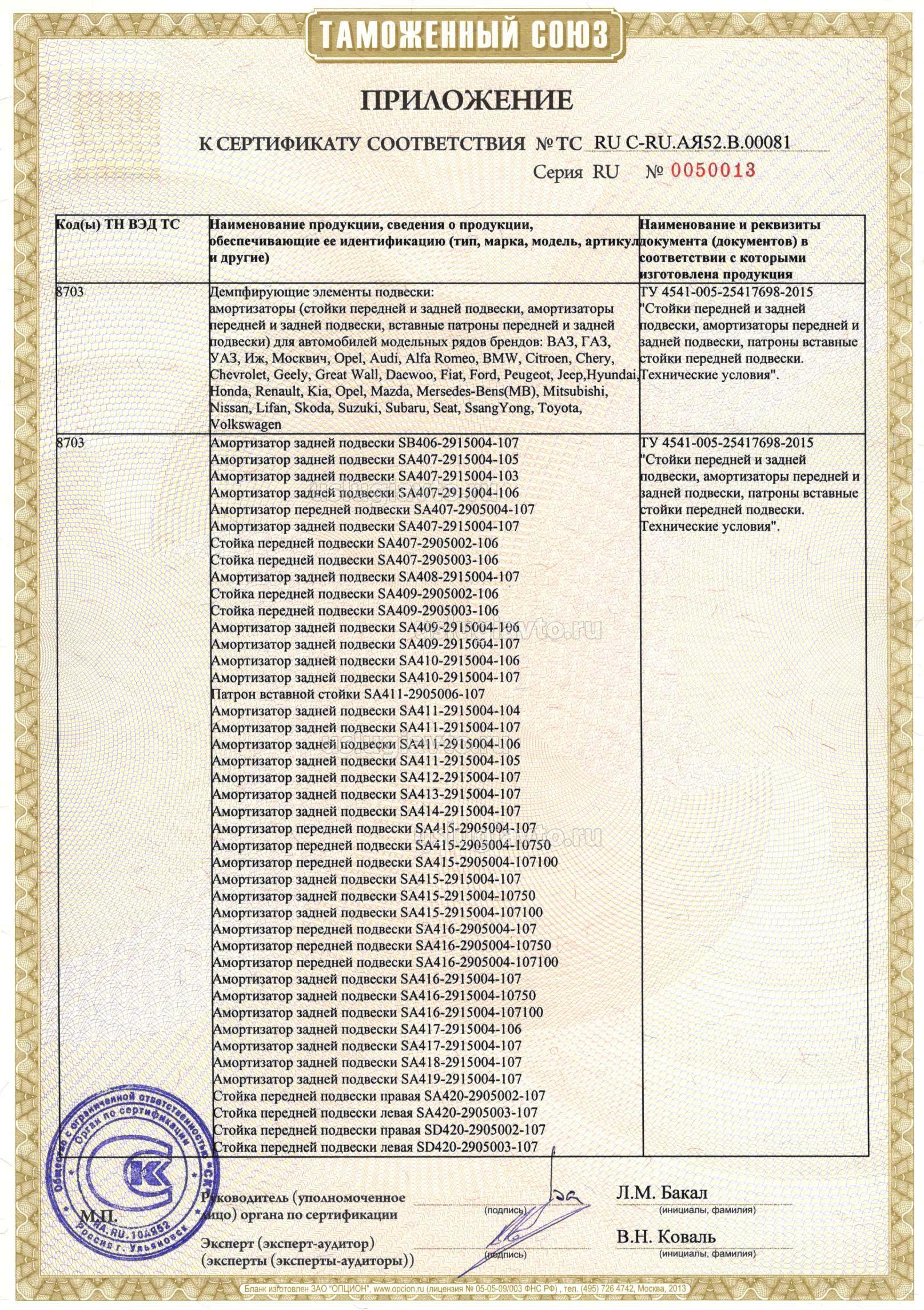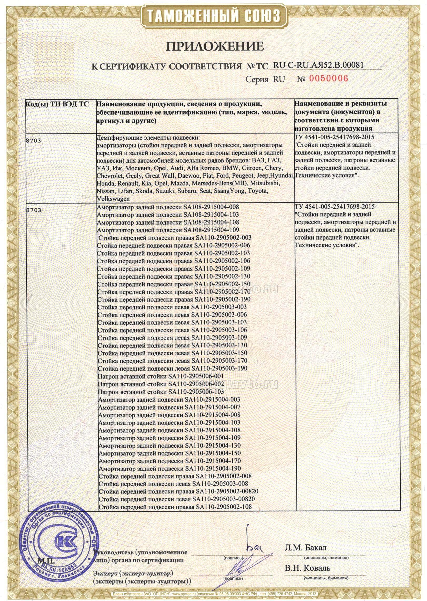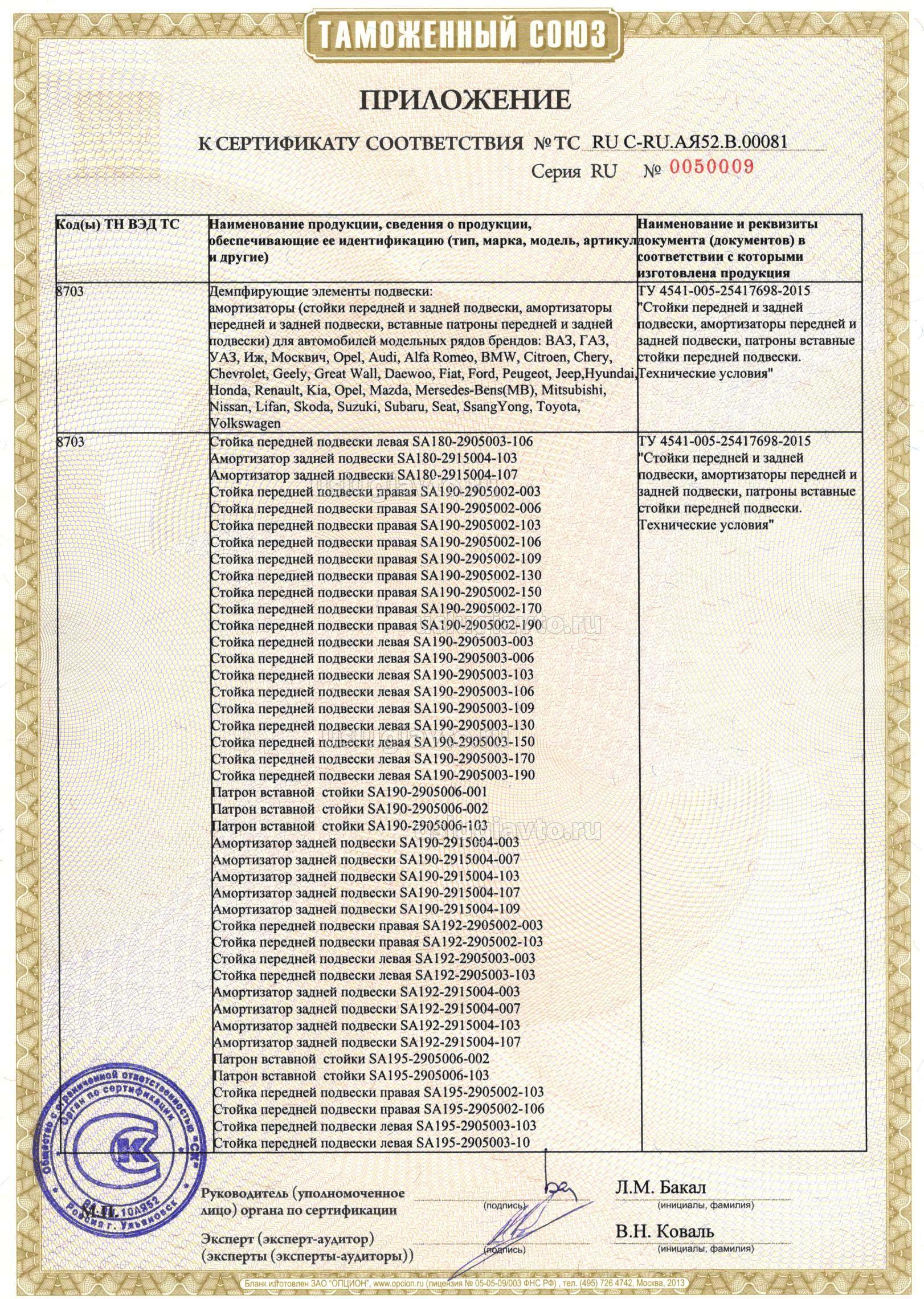 Демпфирующие элементы подвески: амортизаторы (стойки передней и задней подвески, амортизаторы передней и задней подвески, вставные патроны передней и задней подвески) для автомобилей модельных рядов брендов: ВАЗ, ГАЗ, УАЗ, Иж, Москвич, Opel, Audi, Alfa Romeo, BMW, Citroen, Chery, Chevrolet, Geely, Great Wall, Daewoo, Fiat, Ford, Peugeot, Jeep,Hyundai, Honda, Renault, Kia, Opel, Mazda, Mersedes-Bens(MB), Mitsubishi, Nissan, Lifan, Skoda, Suzuki, Subaru, Seat, SsangYong, Toyota, Volkswagen, смотрите приложения на 14 листах №№ бланков 0050005, 0050006,0050007, 0050008, 0050009, 0050010, 0050011,0050012,0050013, 0050014, 0050015, 0050016, 0050017, 0050018. Продукция изготовлена в соответствии с ТУ 4541-005-25417698-2015 "Стойки передней и задней подвески, амортизаторы передней и задней подвески, патроны вставные стойки передней подвески. Технические условия".