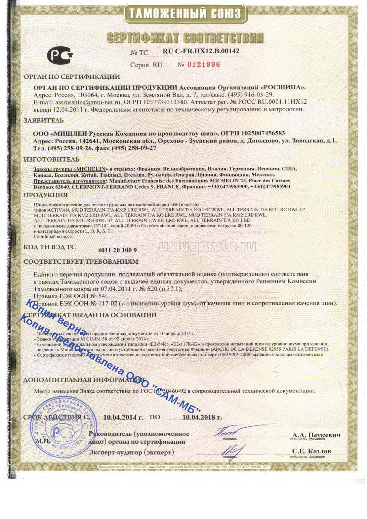Сертификат № ТС RU C-FR.HX12.В.00142 на продукцию "Шипы пневматические для легких грузовых автомобилей марки «BFGoodnch», изготовителя Заводы группы «MICHELIN», серийный выпуск.