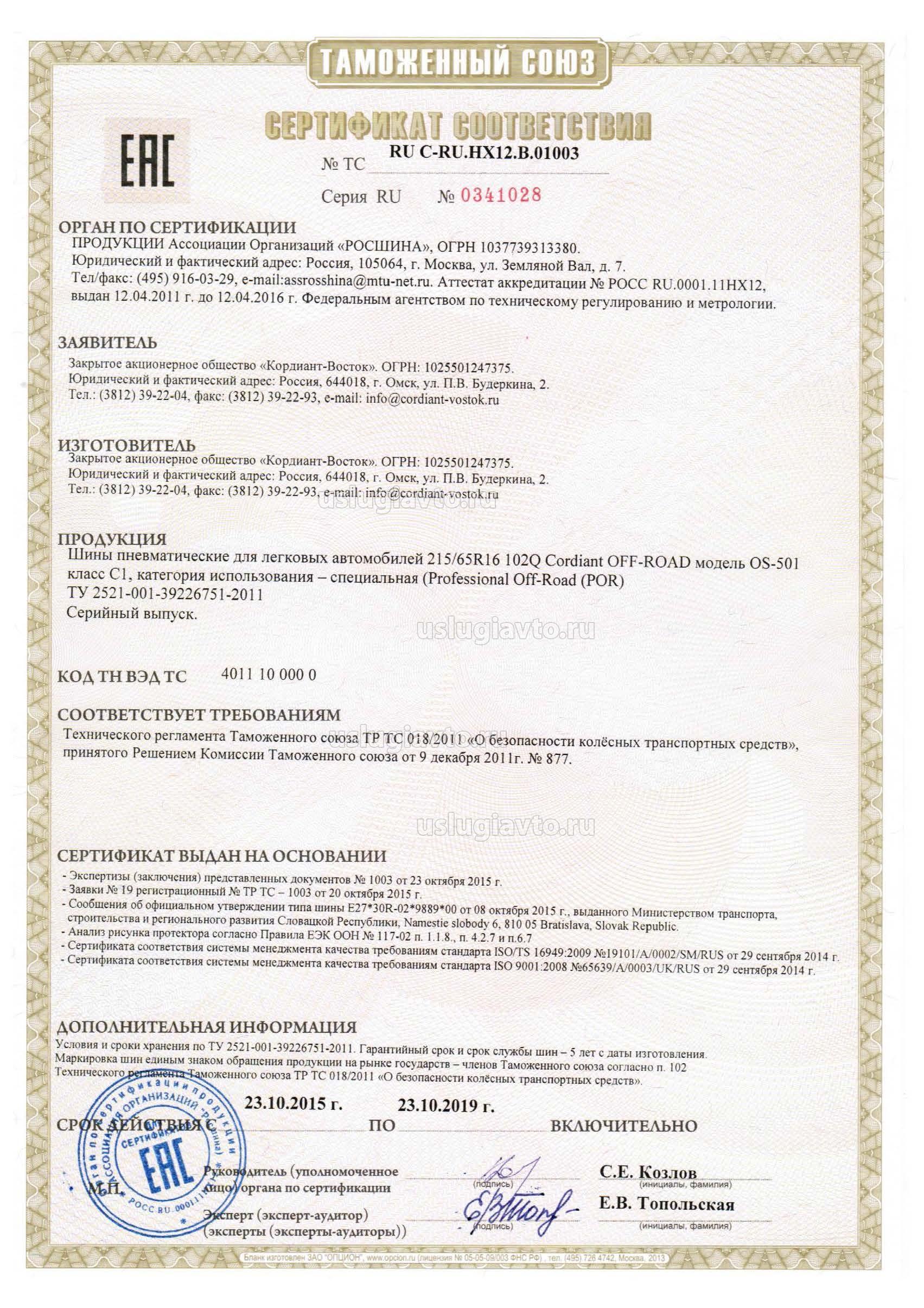 Сертификат № ТС RU C-RU.HX12.В.01003 на продукцию "Шины пневматические для легковых автомобилей 215/65R16, изготовителя Закрытое акционерное общество «Кордиант-Восток», серийный выпуск.