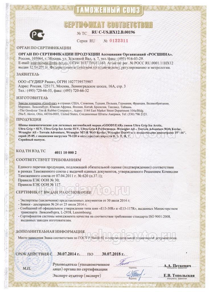 Сертификат № RU C-US.HX12.B.00196 на продукцию "Шины пневматические для легковых автомобилей марки «GOODYEAR», изготовителя заводы концерна «Goodyear»", Серийный выпуск.