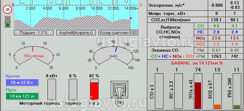 Таким образом можно получить полный комплект характеристик автомобиля, определяющих его топливную экономичность, скоростные свойства, долговечность агрегатов и т.п. При этом, контролируемые расчетные параметры: максимальная скорость, время разгона на отдельных передачах и с переключением передач, расходы топлива при постоянных скоростях движения, в городском и скоростном циклах, на дорогах с переменным профилем и т.п., полученные с помощью программы - укладываются в пределы естественного разброса данных, полученных при натурных испытаниях.