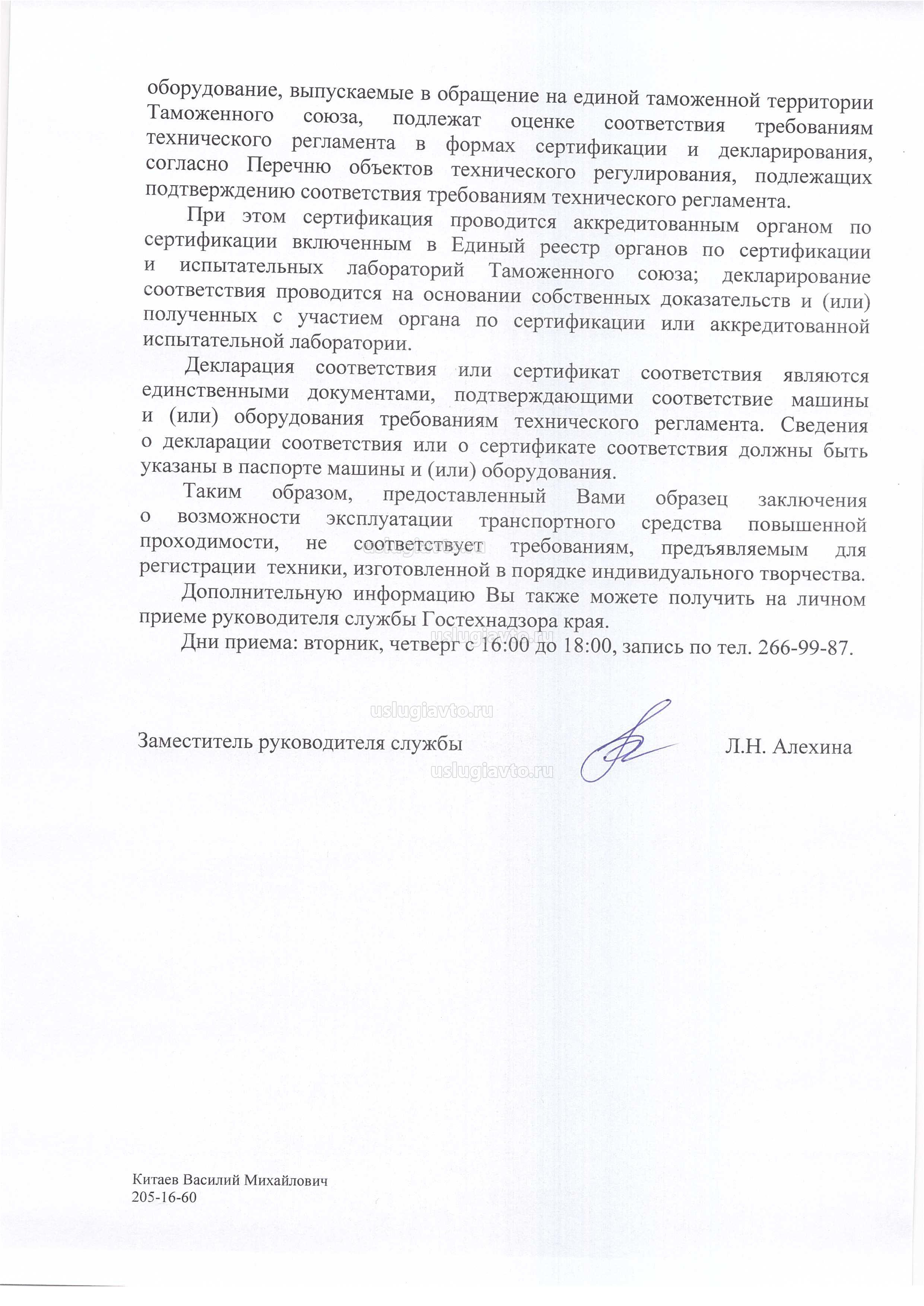 Клиент обратился с образцом нашего заключения в Ростехнадзор, с просьбой дать разъяснения о порядке постановки на учет снегоболотохода собранного самостоятельно. Ему написали официальный ответ, прикрепленный ниже.